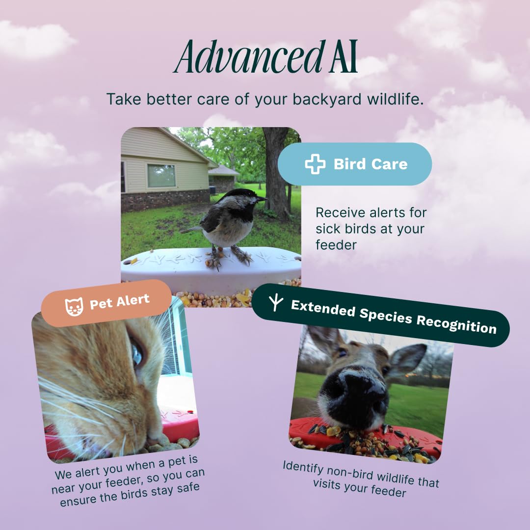 - AI-POWERED BIRDWATCHING APP: The Bird Buddy app uses AI to identify bird species and individual birds, detect signs of illness, and recognize other animal visitors. Get real-time alerts when birds visit your solar bird feeder, easily organize your bird photos, and share your discoveries.