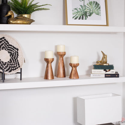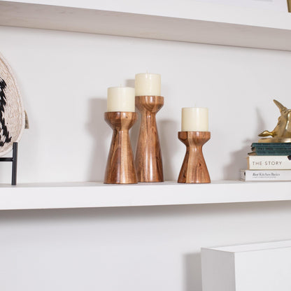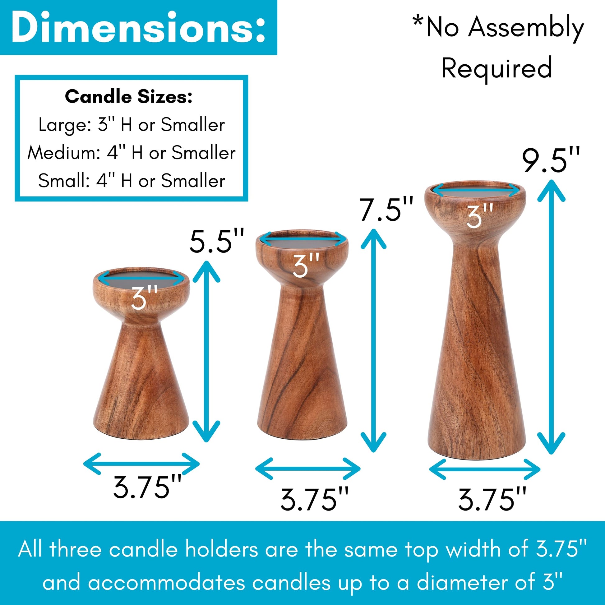 - DIMENSIONS & CARE: Each candleholder in this set stands at approximately 5.5, 7.5, and 9.5 inches tall, providing a visually appealing tiered effect. For best results, dust the wood with a soft cloth regularly. Avoid using harsh chemicals or cleaners to maintain the natural finish and quality of the wood. Accomodates candles up to diameter of 3".
