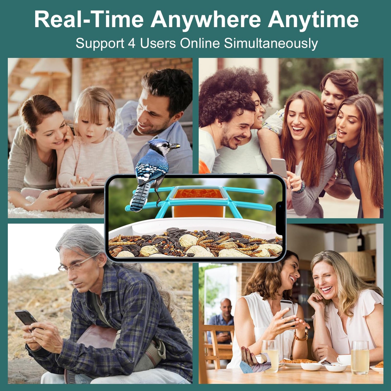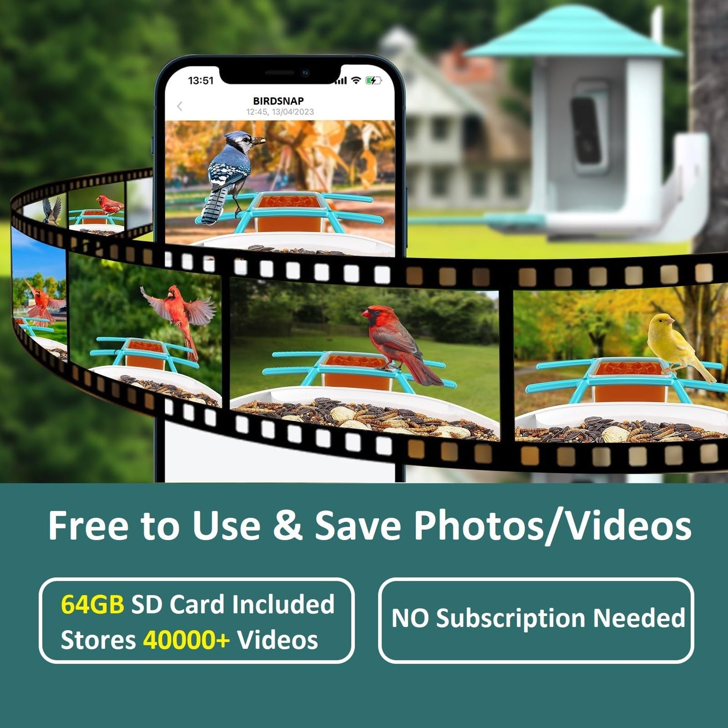 - 📱🔊【Free to Use & Save Videos】Free to use & save photos videos. We also offer 64GB SD Card that can store over 40000 10s videos. This bird camera feeder can connect 4 phones to watch birds simultaneously, sharing with family and friends. With built-in microphone & speaker, you can hear bird sounds and drive away squirrels via App. (Optional cloud & AI recognition needs subscription: identify more than 10000 species)