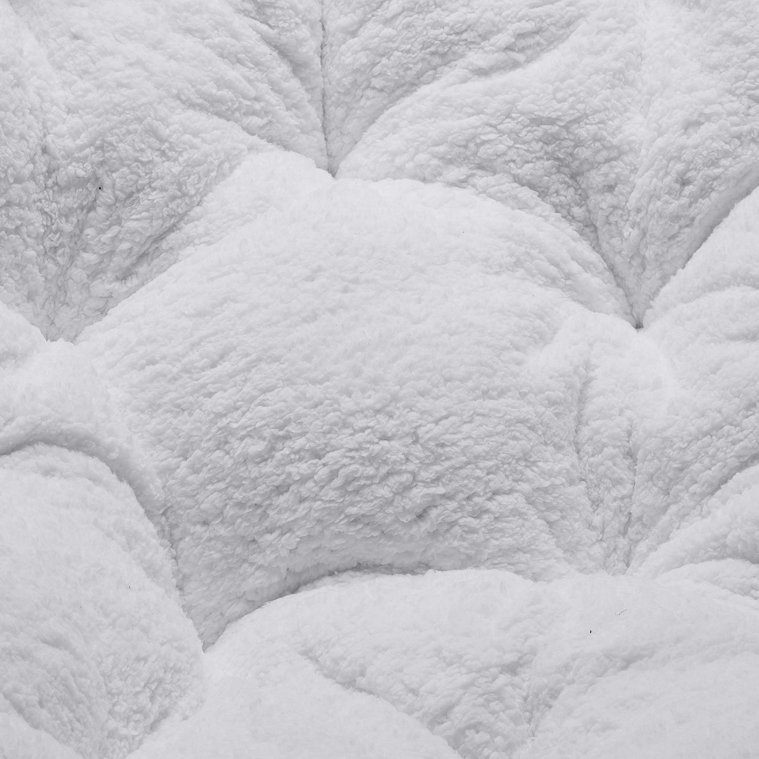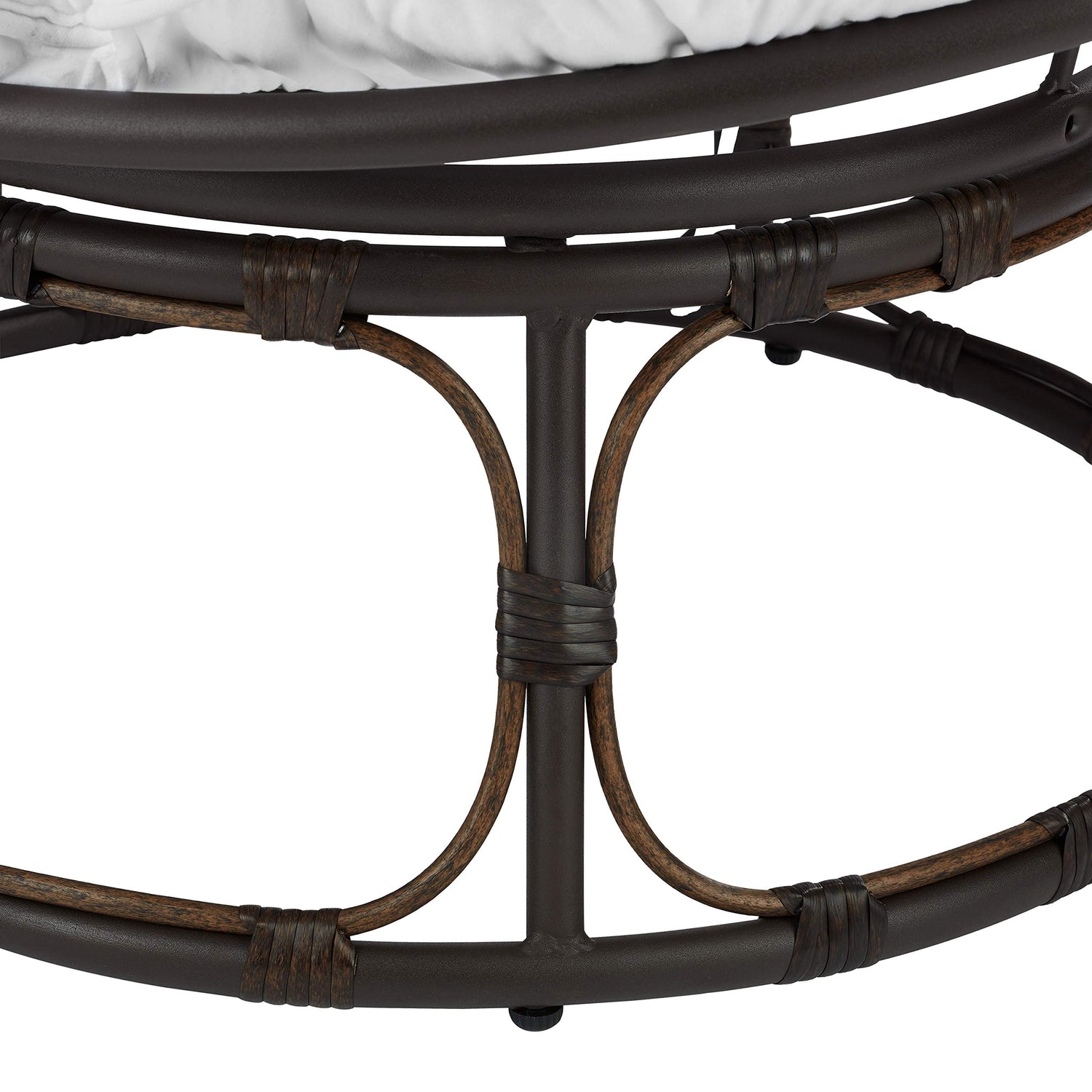 Details: Papasan chair with tufted white cushion on a round, dark brown base Soft cushion is 4.5'' thick with fleecy, Sherpa-style top and welted sides Sherpa-style cushion has a fuzzy, fleecy textured top that provides a cozy place to rest, read, socialize, or study Brown steel frame is accented with faux wicker accents for a casual, boho look Chair bowl attaches securely to base for comfort and stability A great addition to teen bedrooms, family rooms, and other indoor spaces Frame made from steel with polyethylene accents Polyester cushion Hand wash only, non-chlorine bleach when needed, lay flat to dry. Cool iron if necessary. Do not dry clean Round papasan chair measures 44.9'' L x 44.9'' W x 33.5'' H Holds up to 250 lbs. Easy assembly