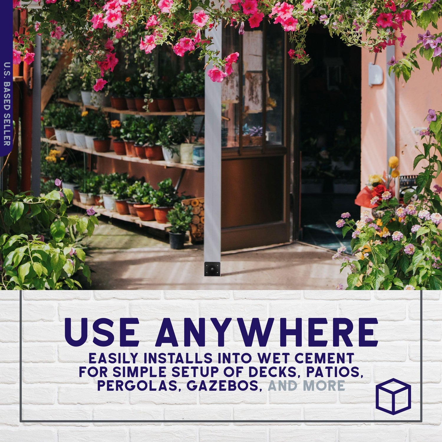 - [Anchor Your Cemented Posts]: The BISupply U-Shaped 4x4 Post Anchor Concrete Brackets 4 Pack fits standard 4 x 4-inch (10.2 x 10.2 cm) square posts; (2) 3.75-inch (9.5 cm) long closed sides with predrilled screw holes and (2) 3.4-inch (8.6 cm) long open sides