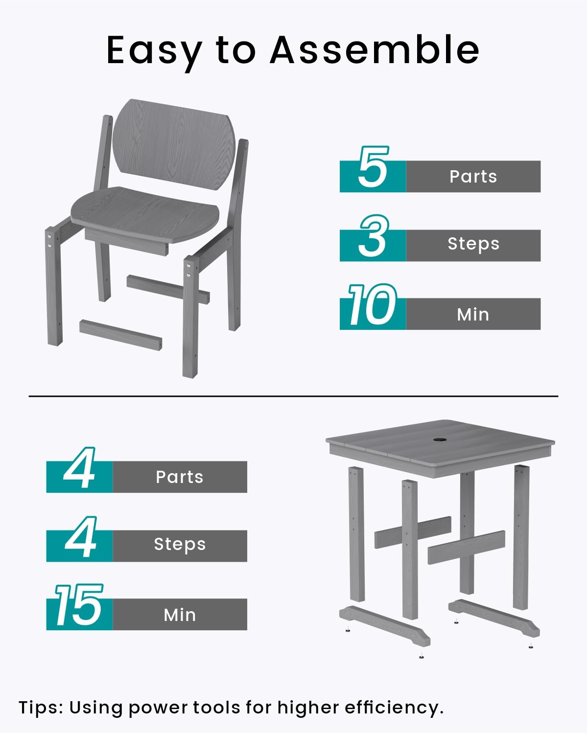 - Easy to Assemble: Simple construction with clear user manual; The table includes 5 parts and can be assembled in just 4 steps; the chair includes 4 parts and requires only 3 steps to assemble; Using power tools improves efficiency even further