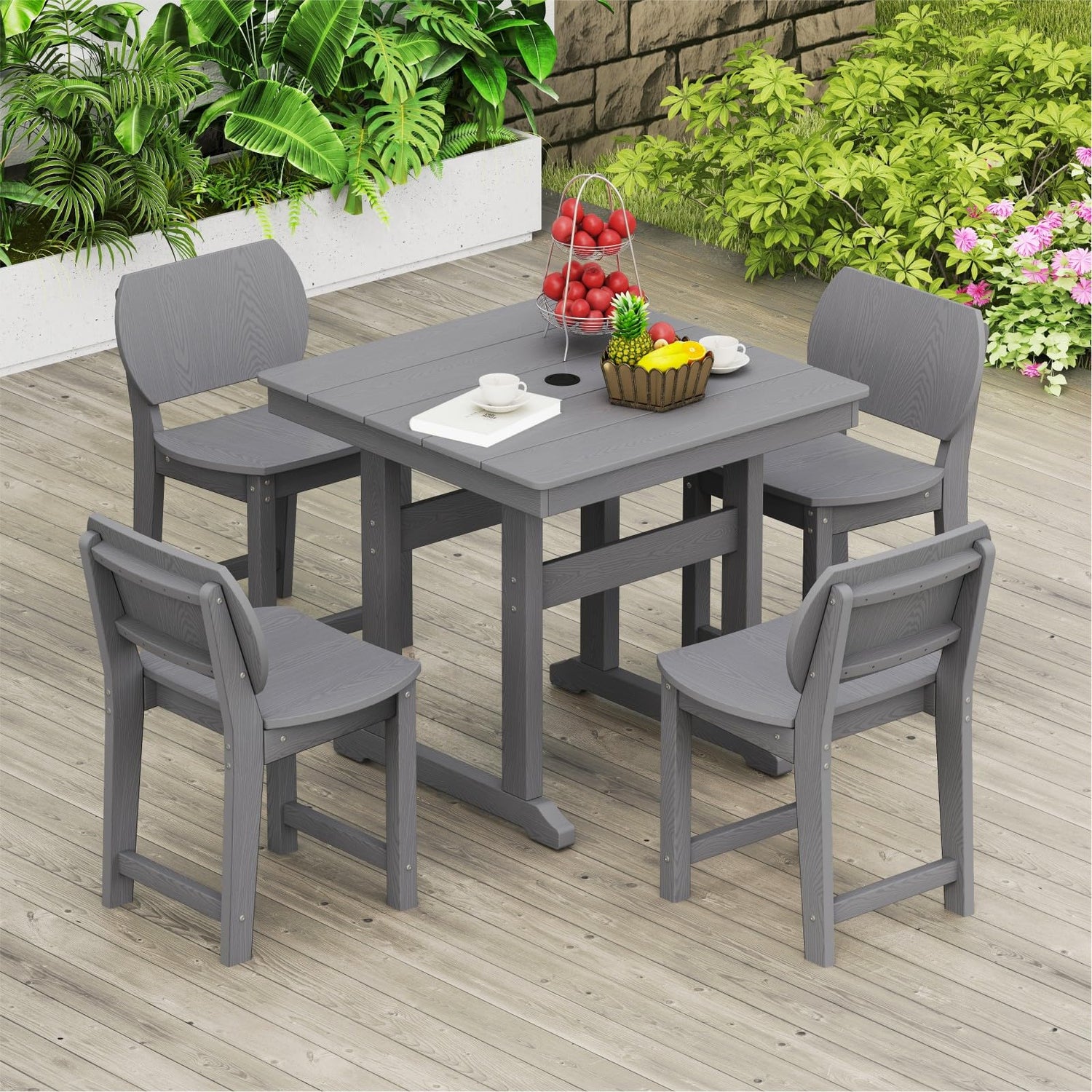 BIVODA 5-Piece HDPE Outdoor Patio Dining Set (Includes 1 Square Table and 4 Chairs) (All-Weather, Easy to Assemble, Umbrella Hole, 10+ Years of Lifespan) - Grey