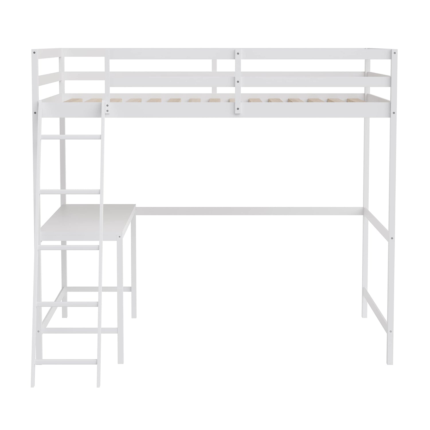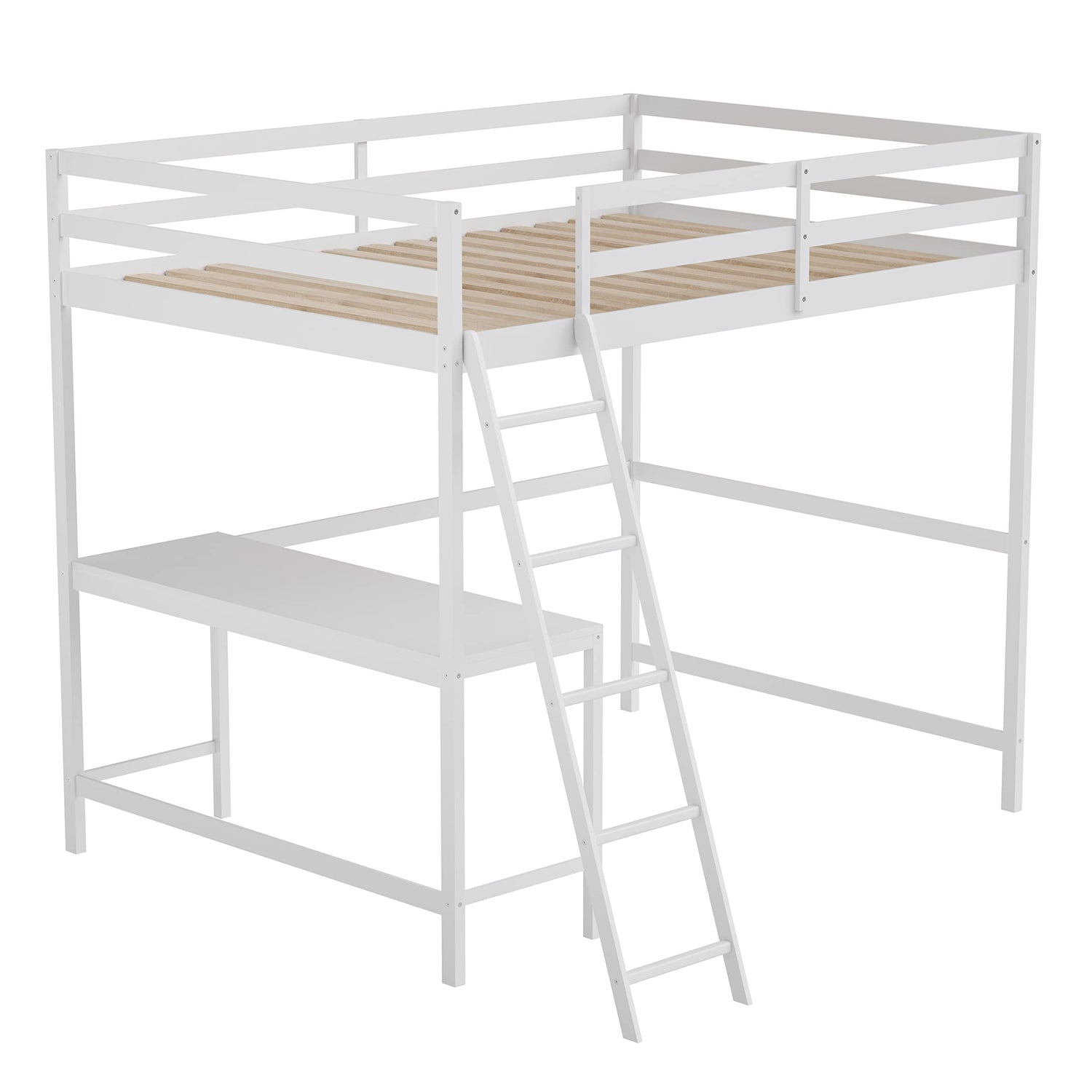 BizChair Full Size Loft Bed with Integrated Desk - White Wood Slats - Space-Saving Design for Kids and Teens