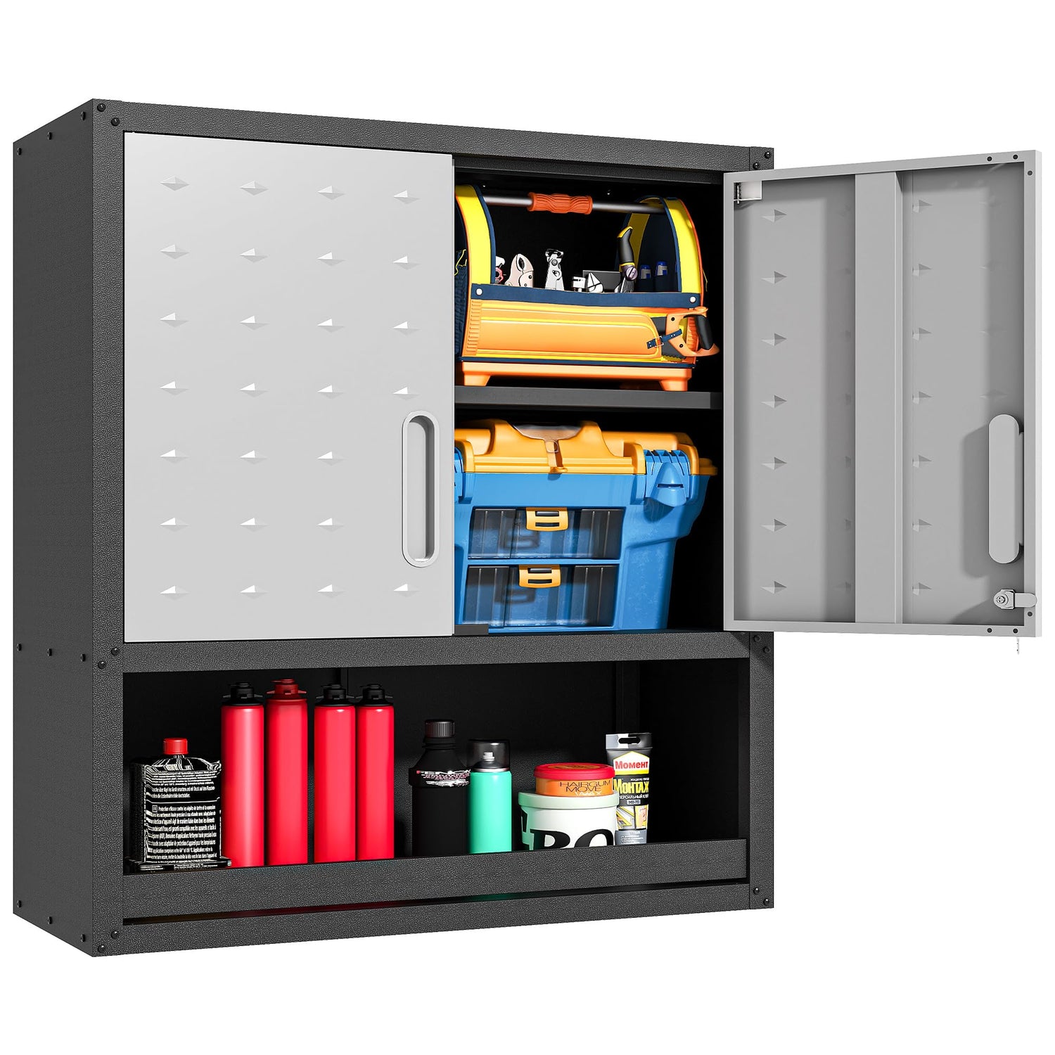 - ADJUSTABLE DIVIDERS:This garage cabinets and storage system comes with two keys to lock the doors and keep your items safe. The interior of the wall cabinet comes with 1 divider that can be adjusted to different heights depending on the size of your items to suit your needs. Underneath the metal cabinet, there is an open divider to store your temporary or frequently used items for quick access.