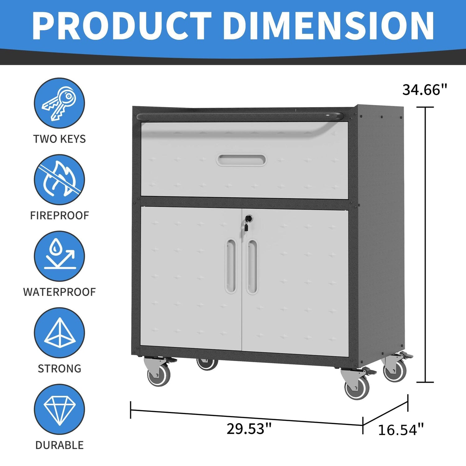 - MULTIPLE STORAGE OPTIONS: The cabinet measures 16.54"D x 29.53"W x 34.66"H. The cabinet comes with 1 large capacity drawer and 2 lockable doors and the top of the cabinet can also be used as a workbench. It is perfect for storing tools in the garage.