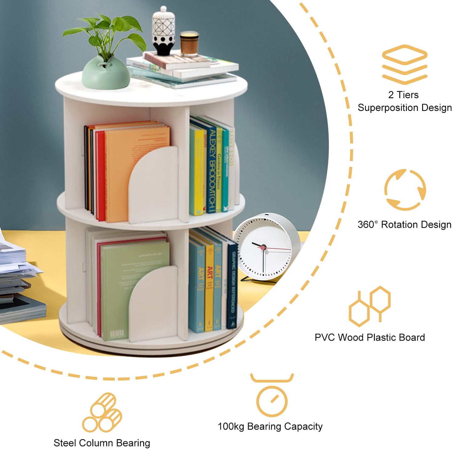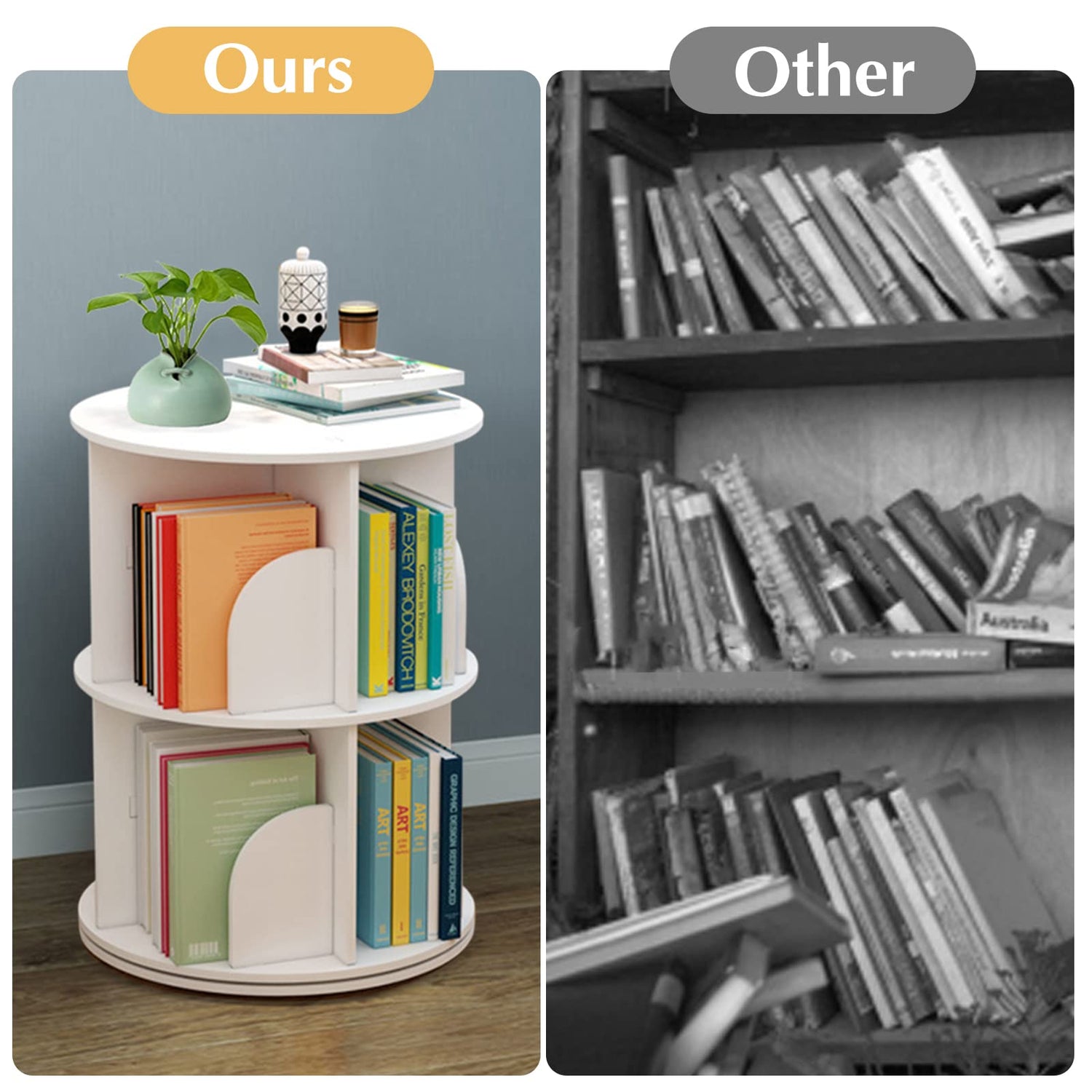 The unique rotating feature allows the 2-tier bookshelf to turn a full 360 degrees, making it incredibly convenient for sorting and accessing your books and decorative items. No longer will you need to shuffle through stacks of items; simply rotate to showcase what you need.