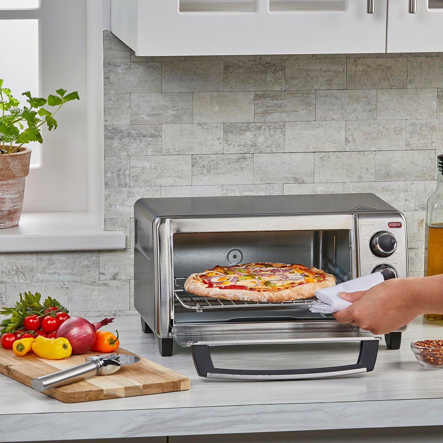 - 9” Pizza, 4 Slices of Bread - The compact toaster oven fits nicely on the countertop, while the curved interior makes room for 9” pizzas and 4 slices of bread.