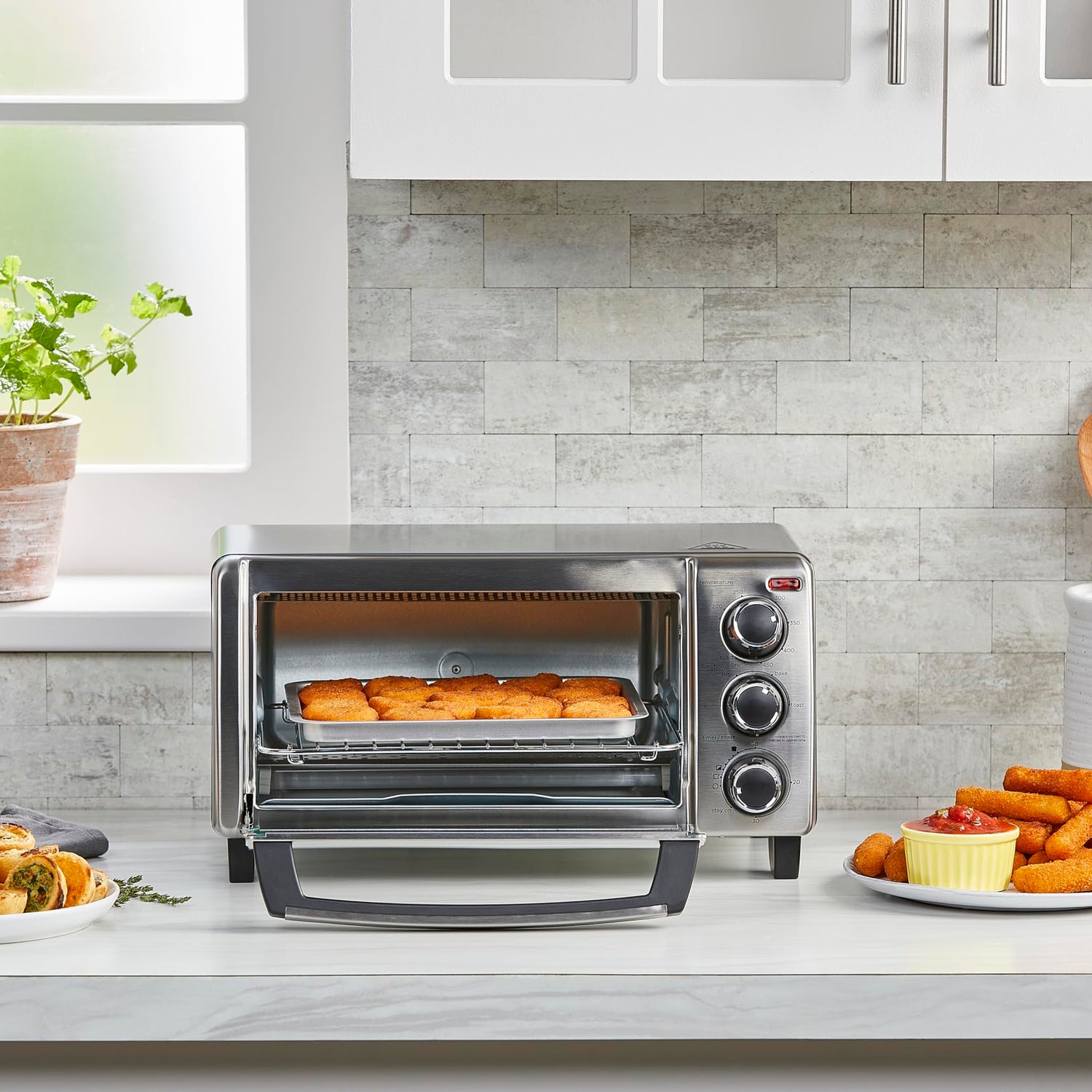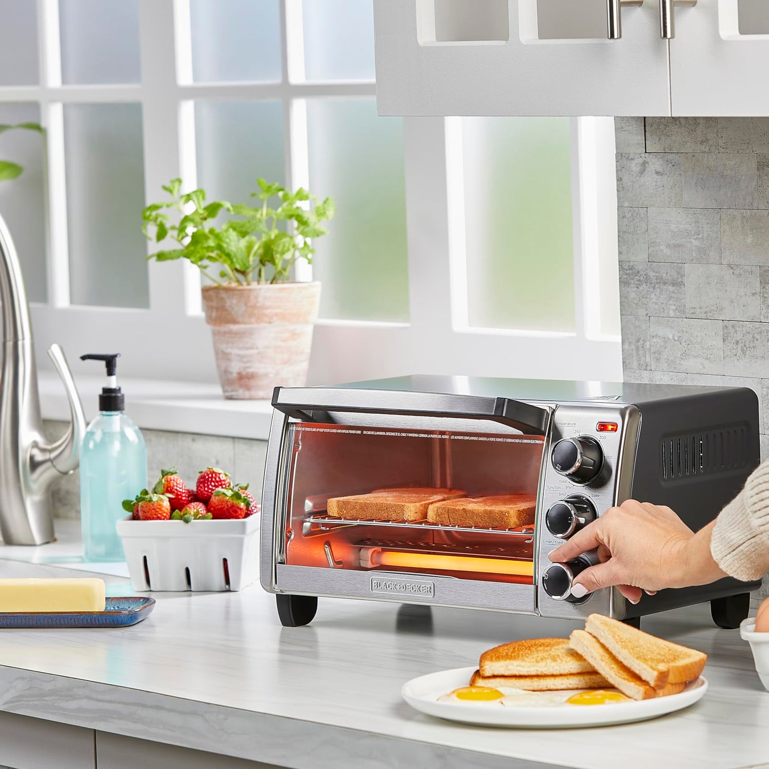 BLACK+DECKER 4-Slice Toaster Oven, Even Toast, 4 Cooking Functions Bake, Broil, Toast and Keep Warm, Removable Crumb Tray, Timer