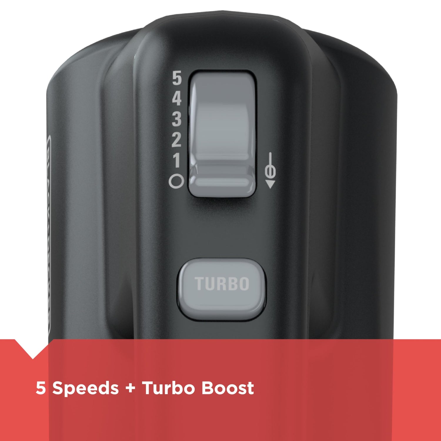 BLACK+DECKER 5-Speed Hand Mixer, 250-Watt for mixing batters, doughs, spreads & more, Turbo Boost & Prevent Splatter Function, Black