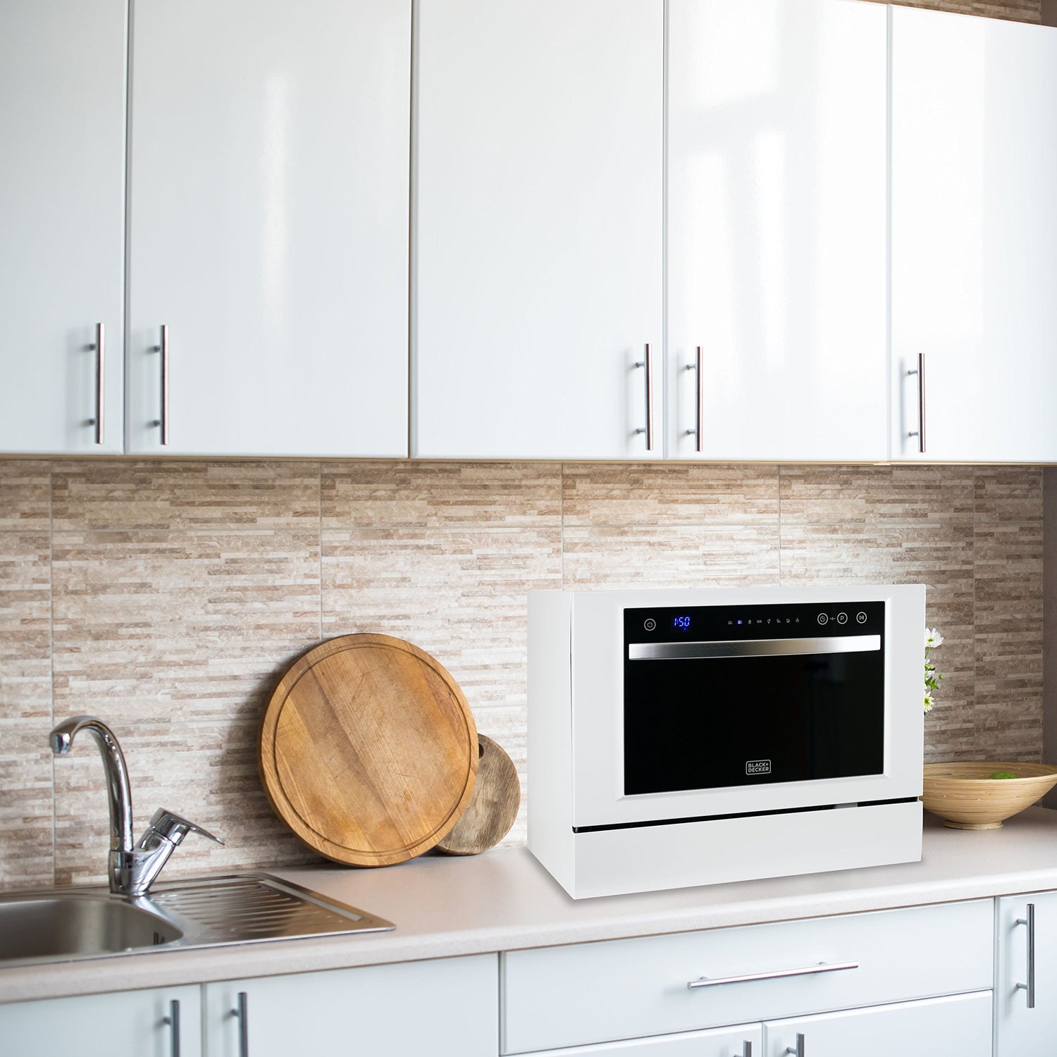 Details: Your cramped kitchen may not lend itself to a built-in dishwasher but that doesn't mean you need to deny yourself one. The BLACK+DECKER Compact Countertop Dishwasher has plenty of room and plenty of features. It can accommodate 6 place settings, including dinner plates up to 10 in. It has 7 wash programs, yet can easily sit on a standard countertop. Water hookup and drain connections are simple and fast to get you up and running in no time. This compact dishwasher is to be a welcome addition in the kitchen, rec room, den or man cave!