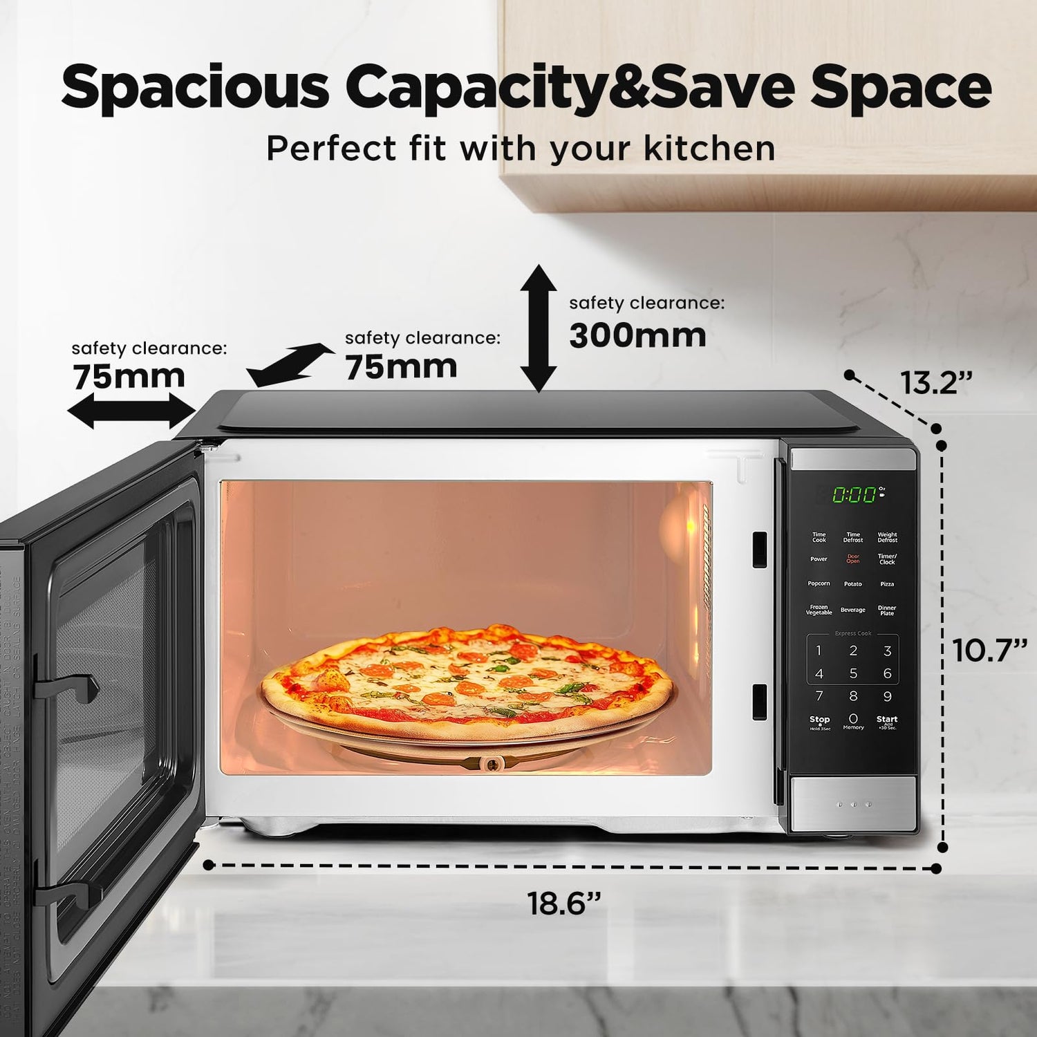 • SPACIOUS 0.9 Cubic Feet CAPACITY: this microwave offers ample cooking space without occupying too much countertop area, can easily fits a 10-inch pizza on the removable turntable, ideal for small kitchens or dorm rooms. Dimensions (H*W*D): 10.7”*18.6”*13.2”