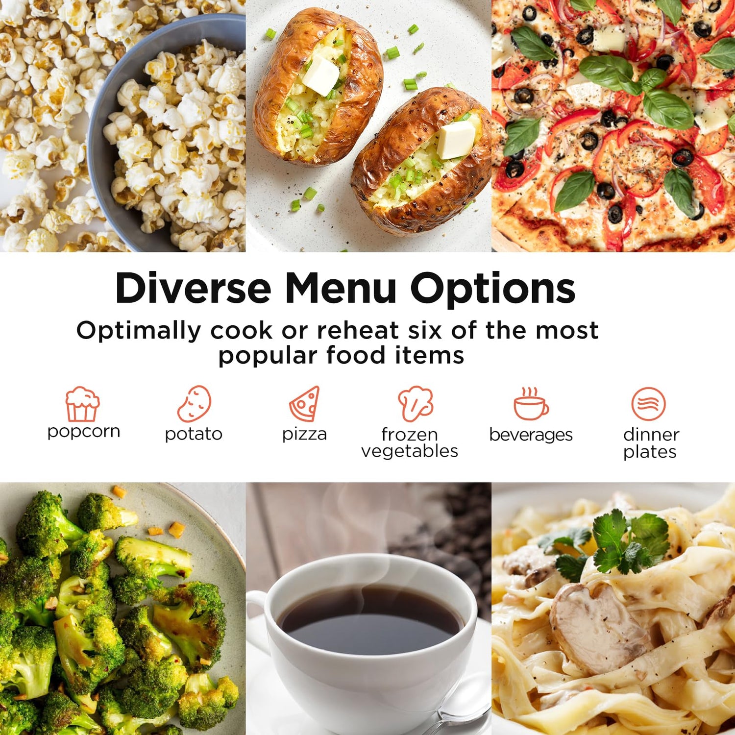 • 6 PRE-PROGRAMMED AUTO MENUS: popcorn, potato, pizza, frozen vegetables, beverages and dinner plates. Perfectly cook your favorite foods, saving your time while ensuring delicious results every time