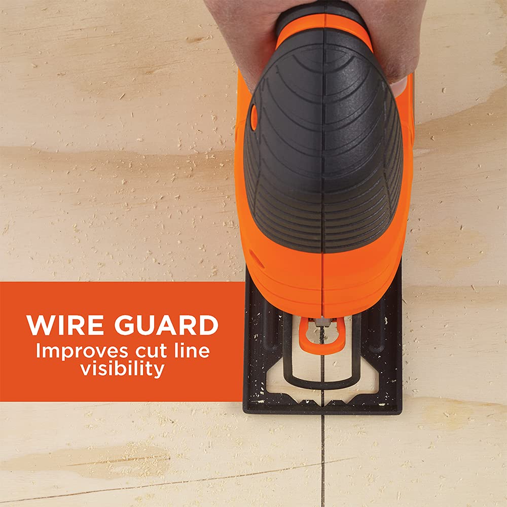 Details: Bring your projects to life and check off home remodeling and repairs with the BLACK+DECKER 4.5 Amp electric jig saw. The variable-speed motor delivers 3,000 spm, allowing you to make quick cuts on a variety of materials. This compact, lightweight jig saw is designed with a tilting base plate for beveled cuts, while the quick-clamp system lets you swap out blades without having to reach for extra tools. Plus, the wire guard provides a clear sightline for enhanced accuracy. You won’t have to worry about excess debris getting in your way because the built-in dust blower keeps sawdust to a minimum. And since this jig saw runs on electricity, you’ll stay powered up until the job is done.