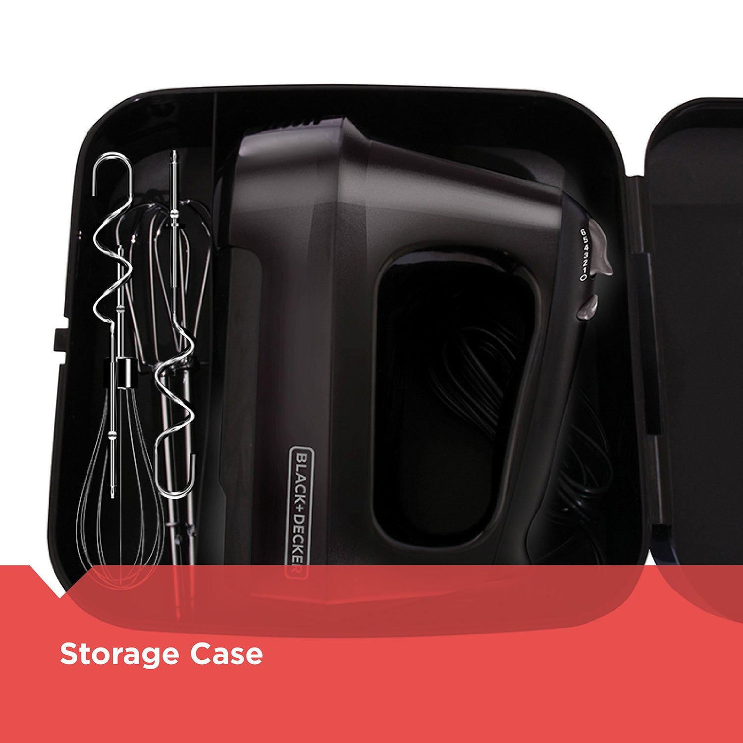Details: The BLACK+DECKER 6-Speed Hand Mixer is for every mixing task. With five dishwasher-safe attachments, you can easily stir, beat, whisk, whip, and even work with dough. With 250 watts of power and a Turbo Boost button, you can do it all in no time. Plus, the starting speed is slower* for less mess mixing! *compared to BLACK+DECKER MX217 Mixers