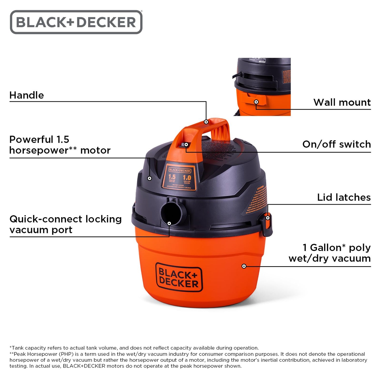 BLACK+DECKER Shop Vacuum Wet and Dry, Small Shop Vac with Accessories, 1 Gallon 1.5 Peak HP, Wall Mount Mini Vacuum for Garage, Home and Pet, 60CFM (BDXV18101P-1H)