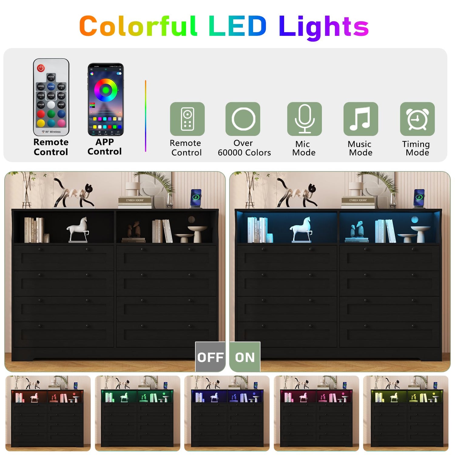 • Built-in Power & LED Lighting: This Large Modern 6 Drawers Dressers includes 2 AC outlets, 2 USB ports, and a 6.56-foot power cord for easy charging. The multi-color LED light bar offers 16 colors and 21 dynamic modes, allowing you to customize the ambiance for any occasion.