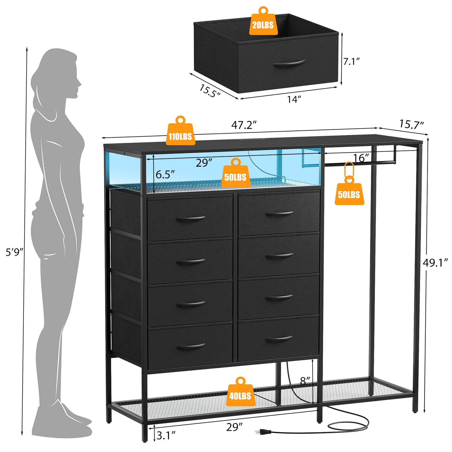 - 【Dresser with Charging Station and LED Lights】Equipped with a built-in power outlet and LED light, this long dresser for Bedroom combines functionality and style. The light color, brightness and strobe mode of the LED dresser can be adjusted at will according to the needs of the scene. This bedroom dresser comes with 2 AC outlets, 2 USB ports and a 6.5ft power cord for your charging needs. You can easily charge mobile phones and other devices as you need! Clothes dresser size: 47.2(W) x 15.7(D) x 49.1(H) inch