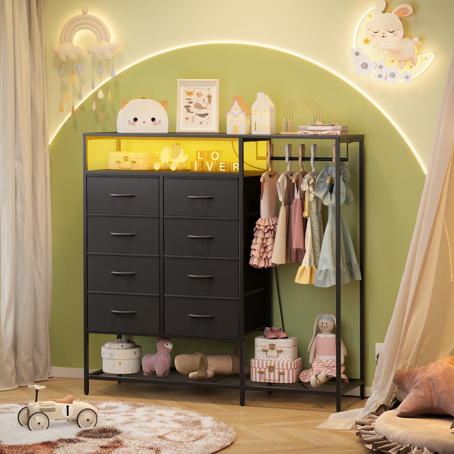- 【Adequate Storage Space】The bedroom dresser with hanging rack maximize storage space compared to traditional bedroom dresser while keeping your daily essentials organized. 8 drawers provide sufficient storage space for blankets, underwear and toys. The open storage cabinet is designed for simple storage. The right clothes rail can hang suits and coats for easy access.