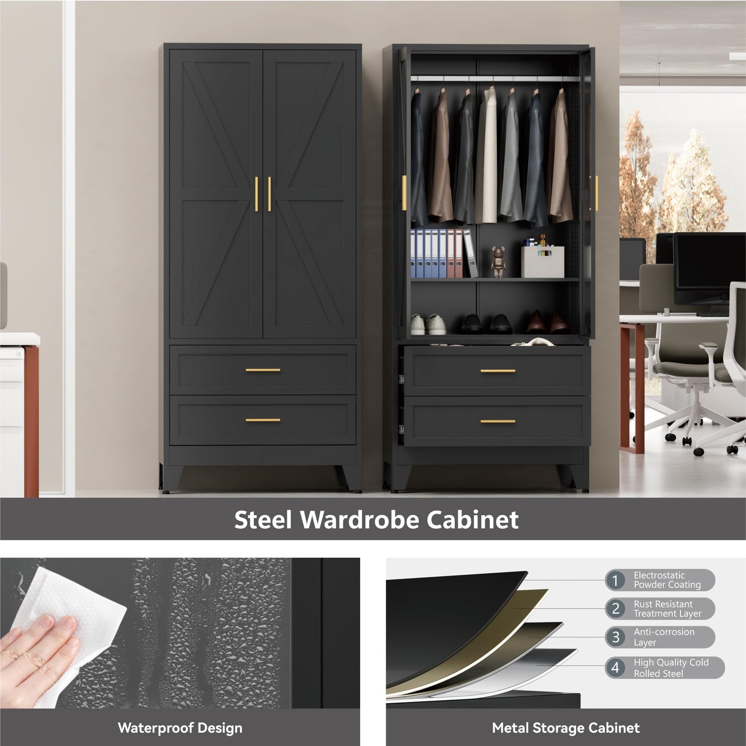 Black Metal Wardrobe Cabinet for Bedroom, 71" Freestanding Closet System with Drawers and Shelves, Hanging Rod Clothing Organizer with Two Doors, Farmhouse Steel Wardrobe Bedroom Armoires