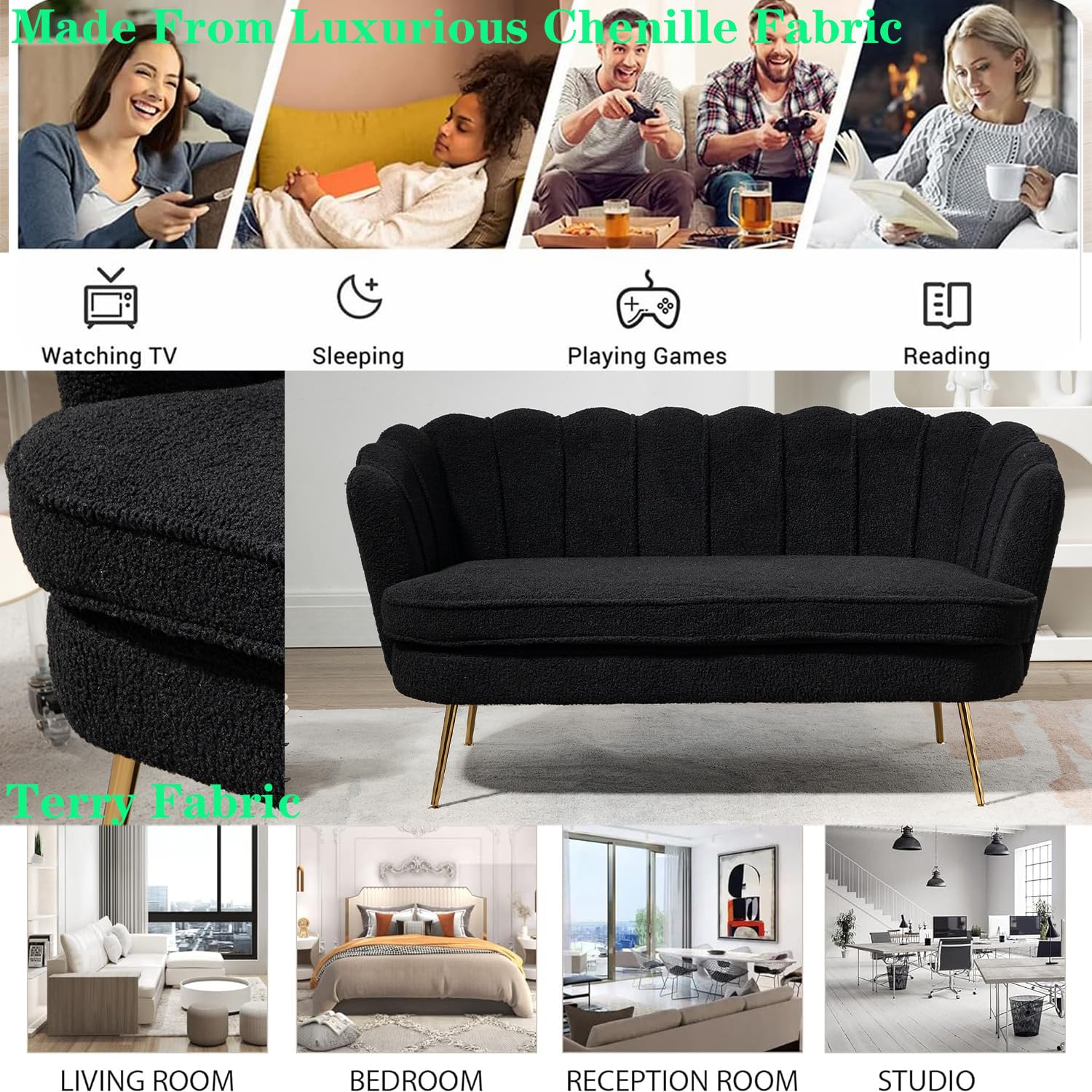 - Spacious and Comfortable; Our black mini couch loveseat is the epitome of opulence, enveloped in full-body Boucle fabric.Feel the embrace of this sumptuous material as it offers a soft and cozy touch, elevating your seating experience to a whole new level. The high-quality fabric also brings an elegant touch to your living space