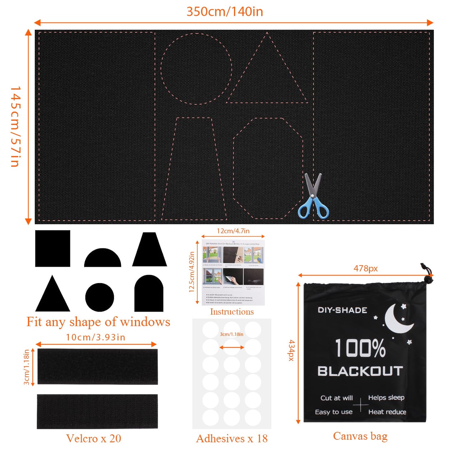 Blackout Blinds 138" x 57", 100% Blackout Curtains for Window, 420D No Drill Portable Black Out Shades Film for Bedroom, Cut to Any Size, Nursery Black Out Blinds for Baby Travel Temporary, 20 Velcro