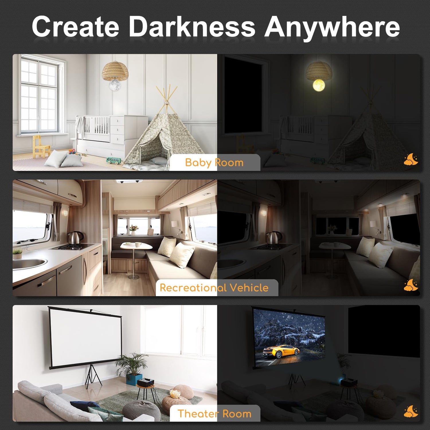- Multiple Usages: Our portable blackout curtains are suitable for various settings and people. it's perfect for use in kids' rooms, nurseries, home theaters, RVs, conference rooms, and hotels.
