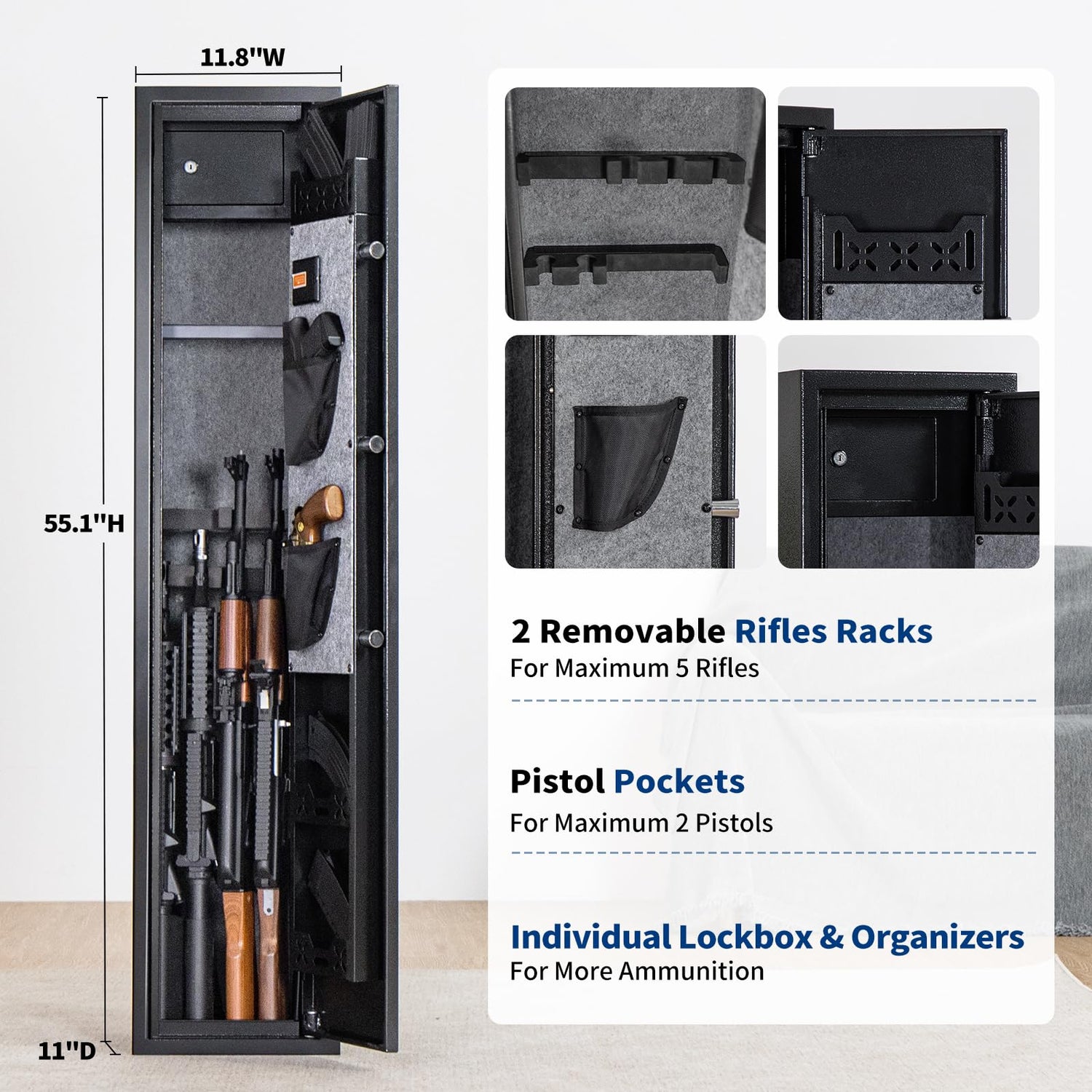 - Stores 5 rifles with removable 3-slot rifles rack & 2-slot rifles rack; Store other firearms accessories with a locking box; Door panel includes 3 gun magazine racks and 2 pistol pockets.