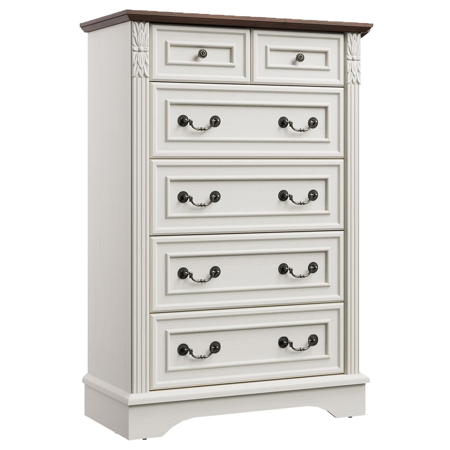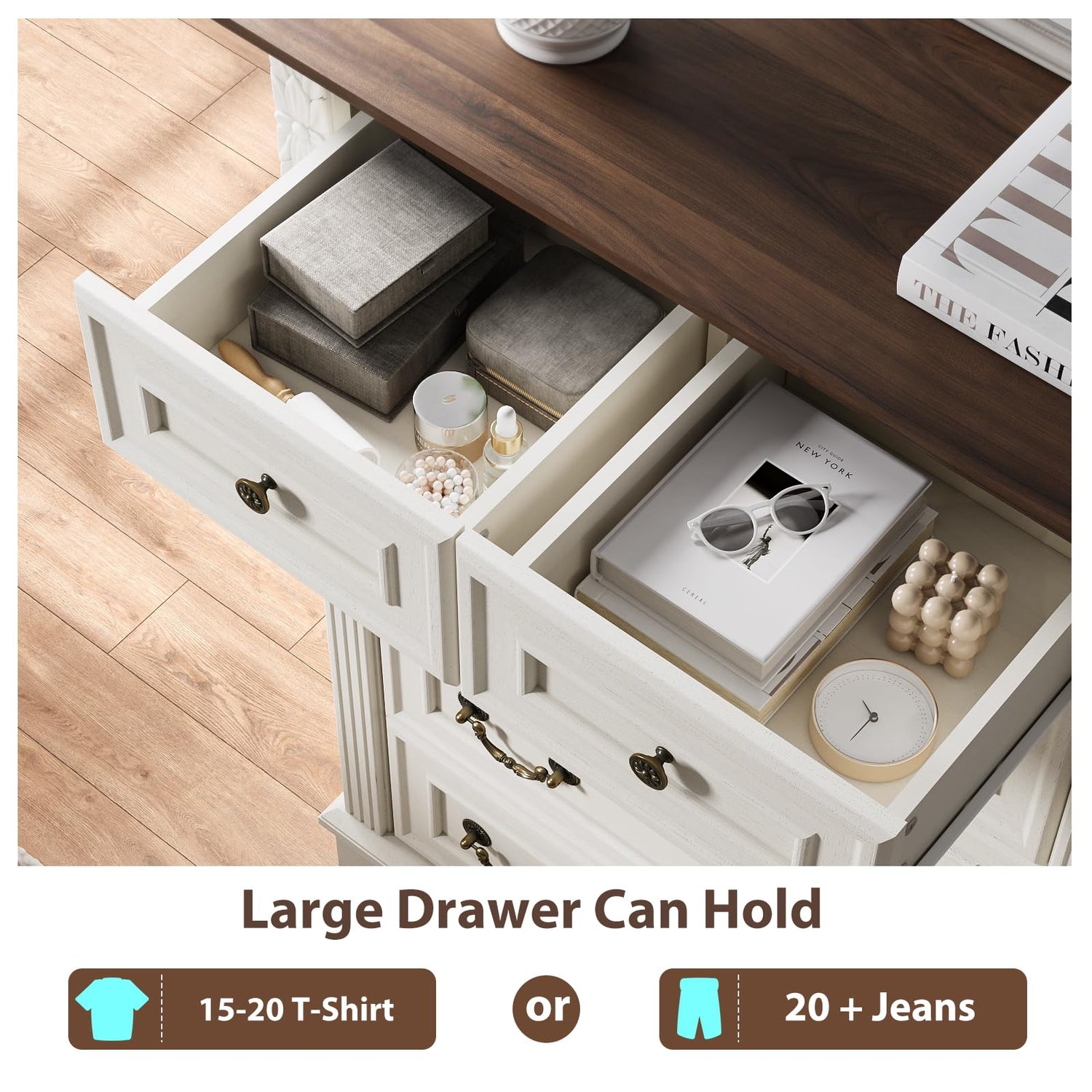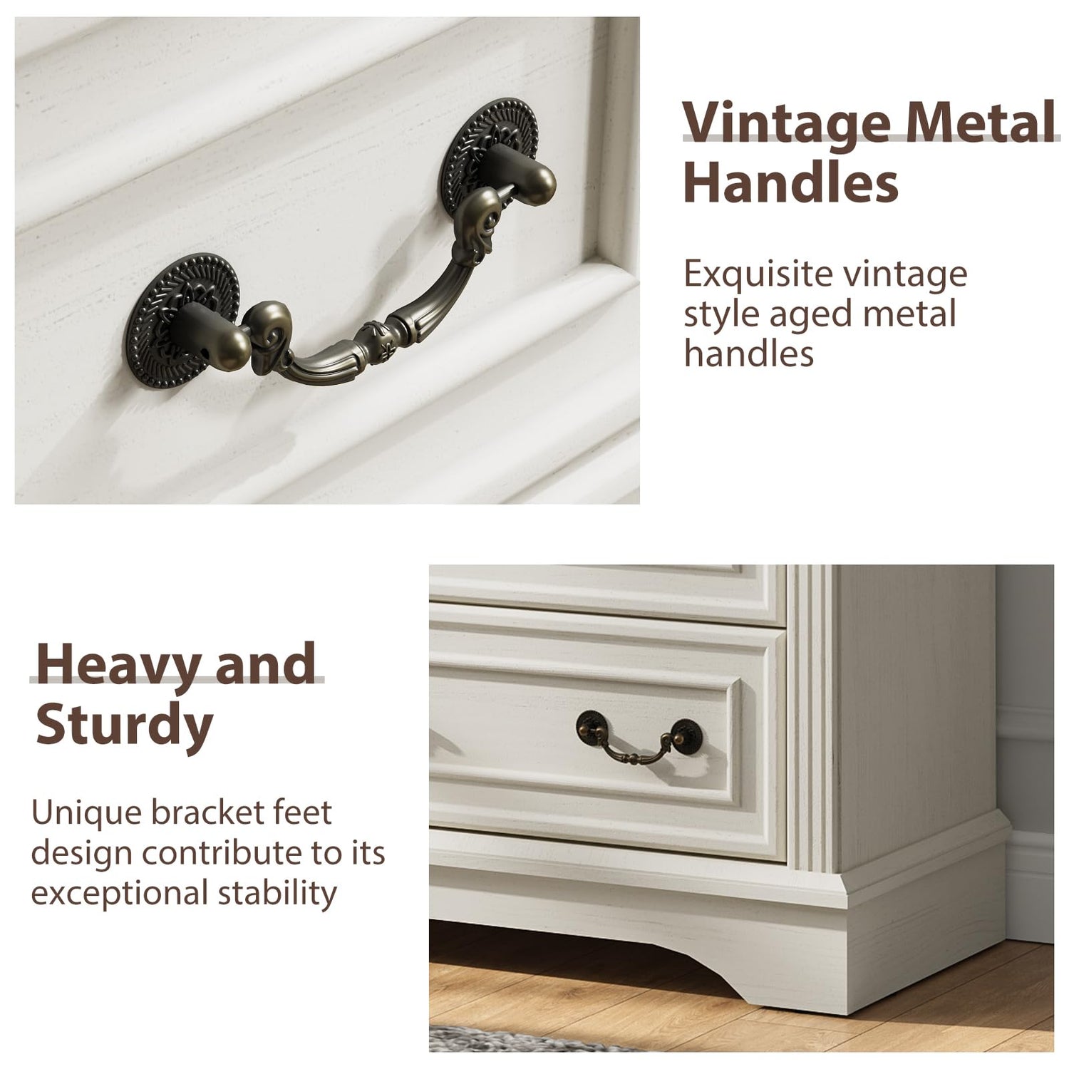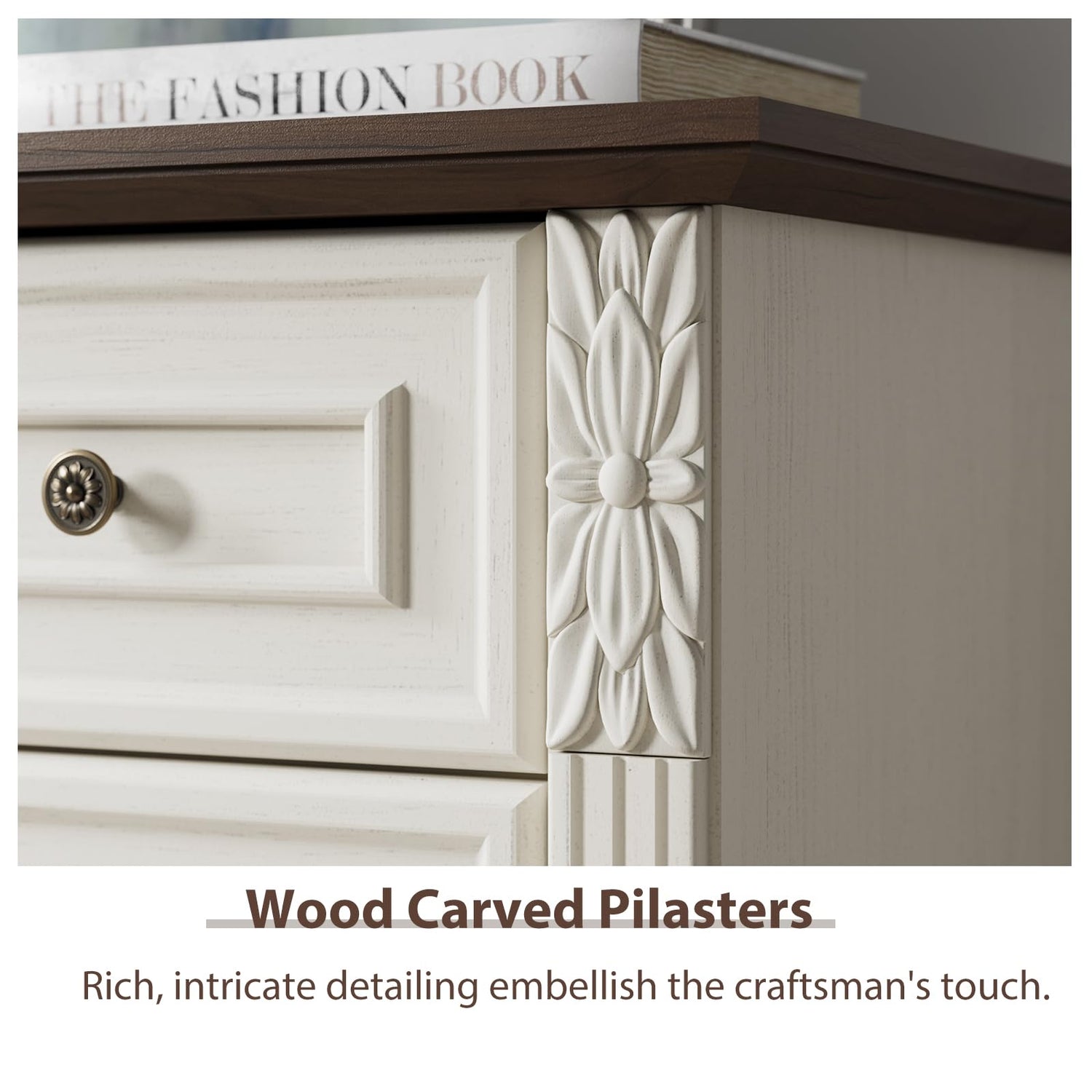 - 【Classic Vintage Style】This antique white 6 drawers dresser is an optimal choice for vintage lovers. The rustic white dresser with wood carvings has 6 thick and wide drawers. The farmhouse style decorative wood carvings and antique brass metal handles will accentuate the vintage style of your room!