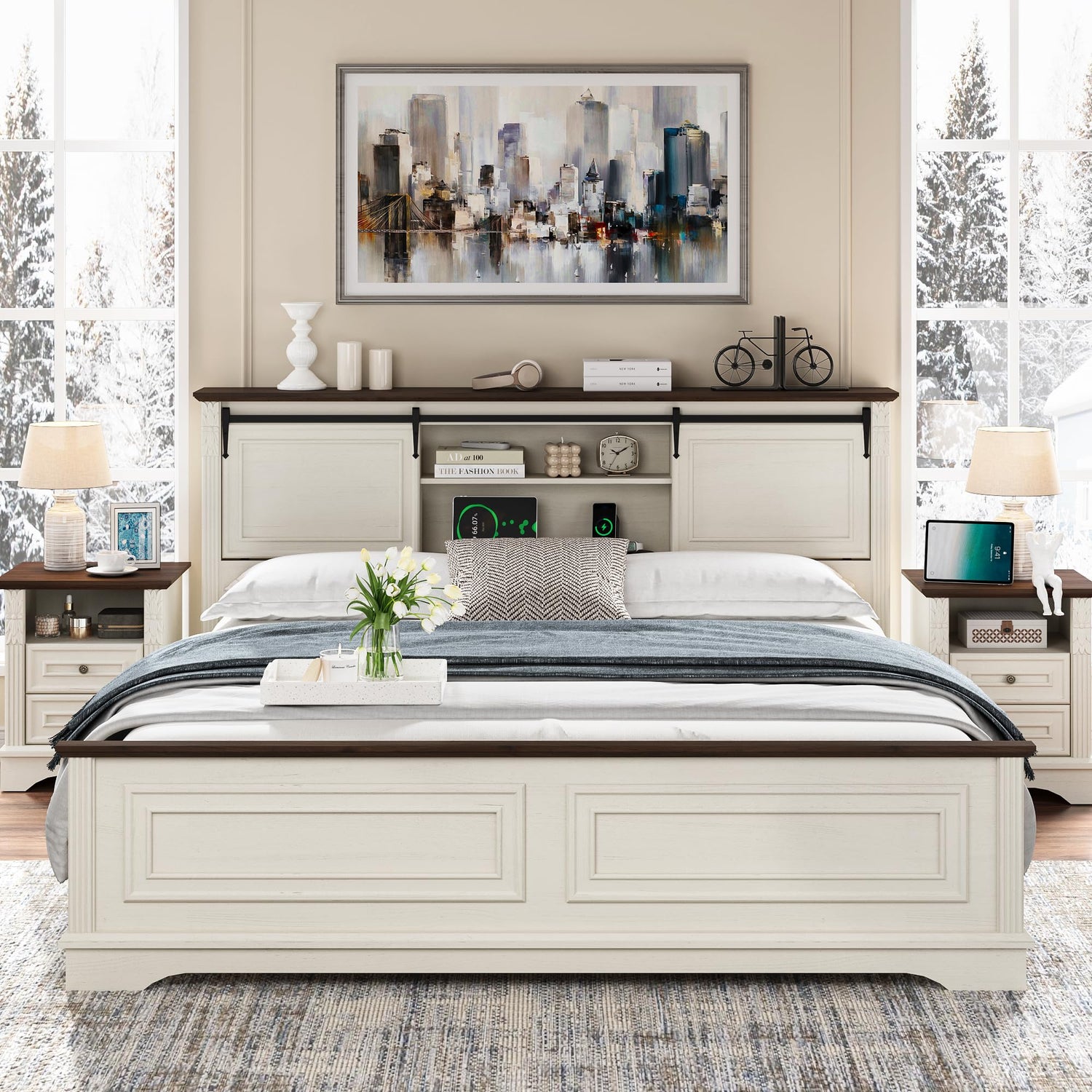 BLANKSPACE Farmhouse King Size Bed Frame with Storage Headboard, Charging Station, Bracket Footboard, Antique White Bed Frame with Bookcase and Sliding Barn Doors, Noiseless