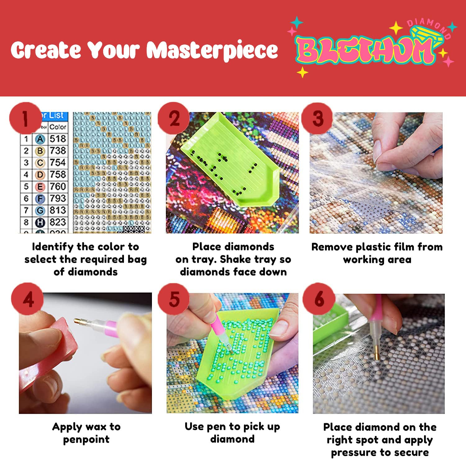 - Diamond Painting Canvas: Waterproof, moisture-proof, wrinkle-free, with detailed instructions and perfect color matching, the symbols are very easy to read. pattern itself has a sticky background and plastic protective film to keep the picture sticky
