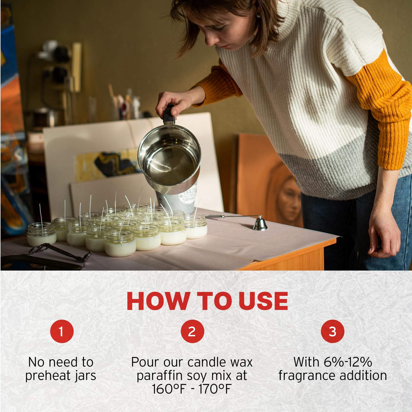 - How To Use: Pour our candle wax paraffin soy mix at 160°F-170°F, with 6%-12% fragrance addition; Melting point of 120°F; No need to preheat jars, as the paraffin candle wax offers strong jar adhesion and won't slump at temperatures up to 100°F