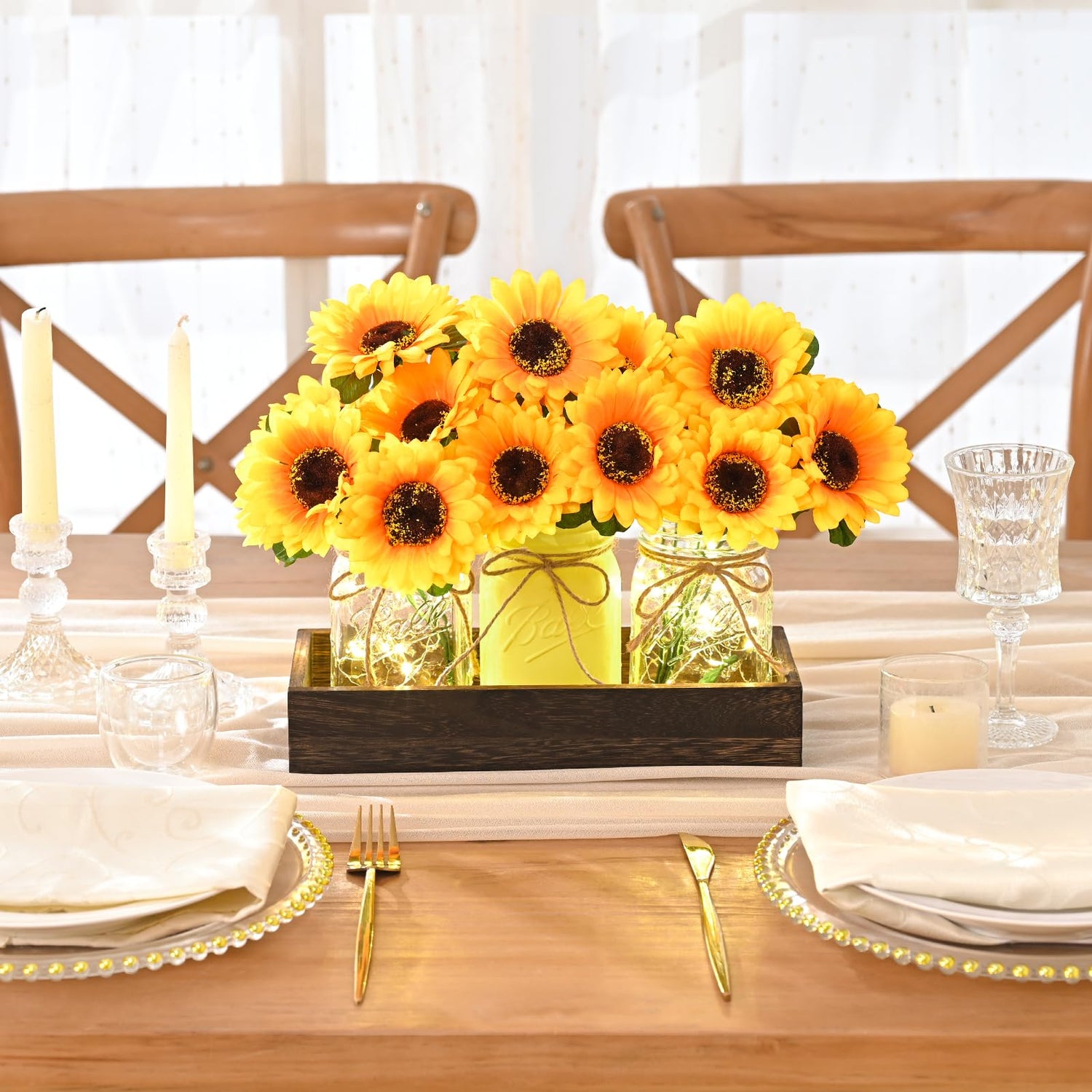 BLEUM CADE Centerpieces Table Decorations - 3Pcs Sunflowers Artificial Flowers in Mason Jars with Wood Tray, Dining Table Centerpiece Decor, Coffee Table Farmhouse Living Room Home Decorations