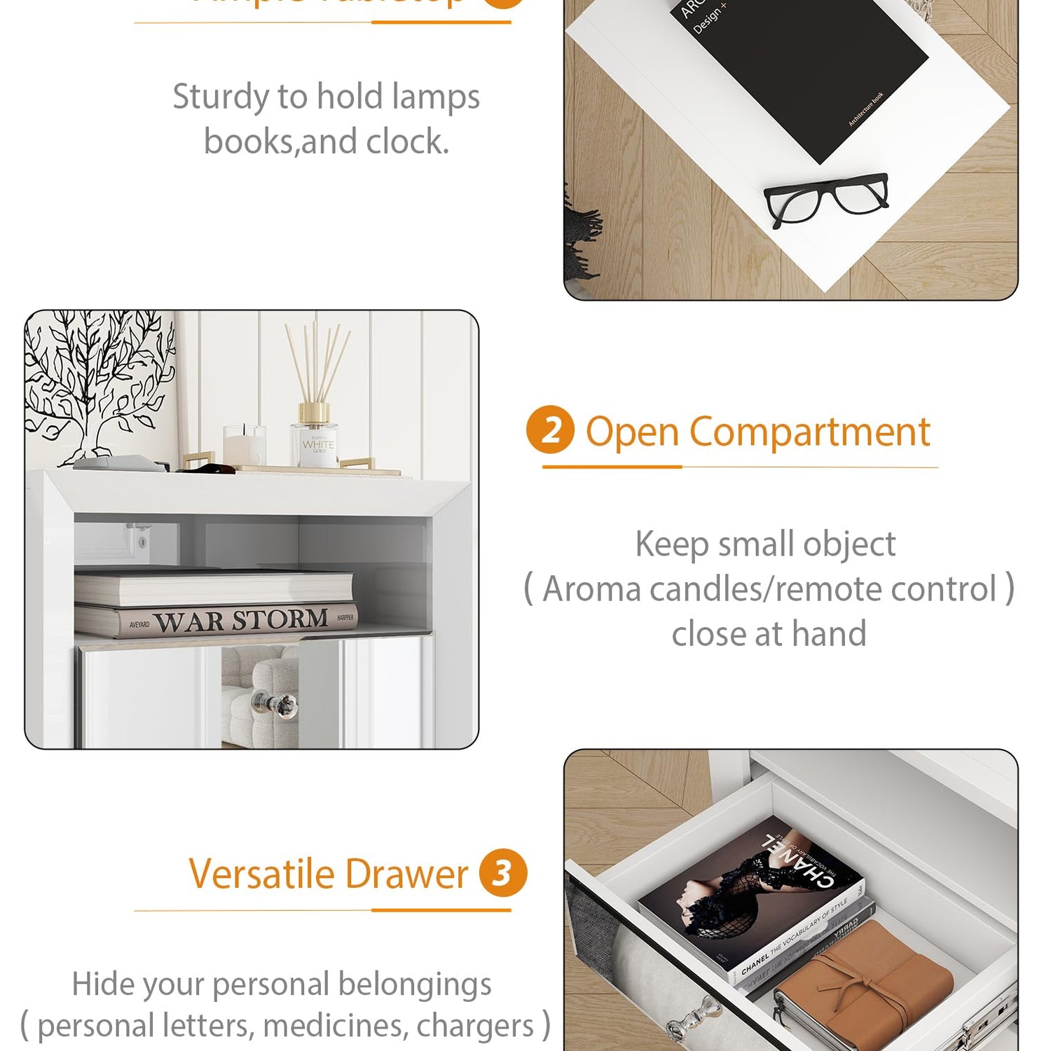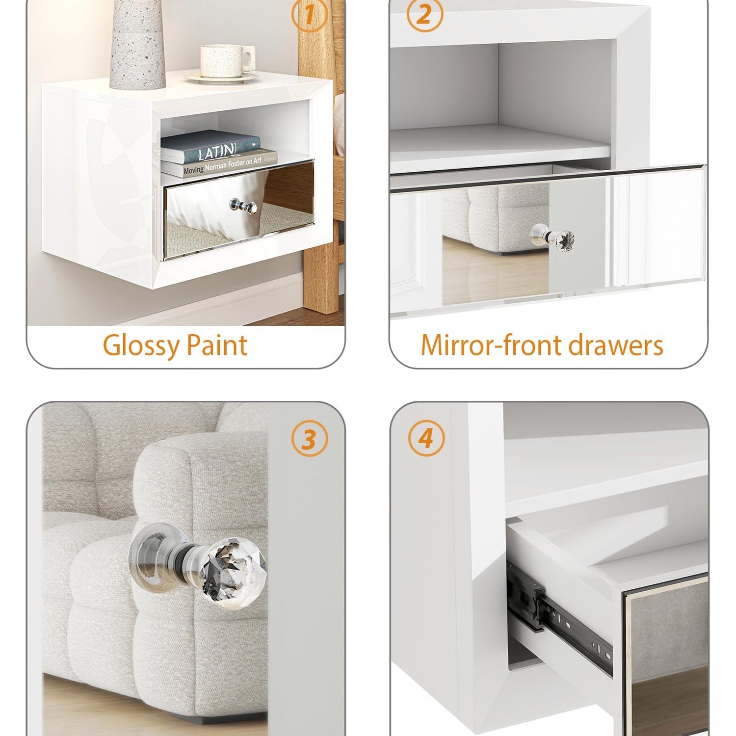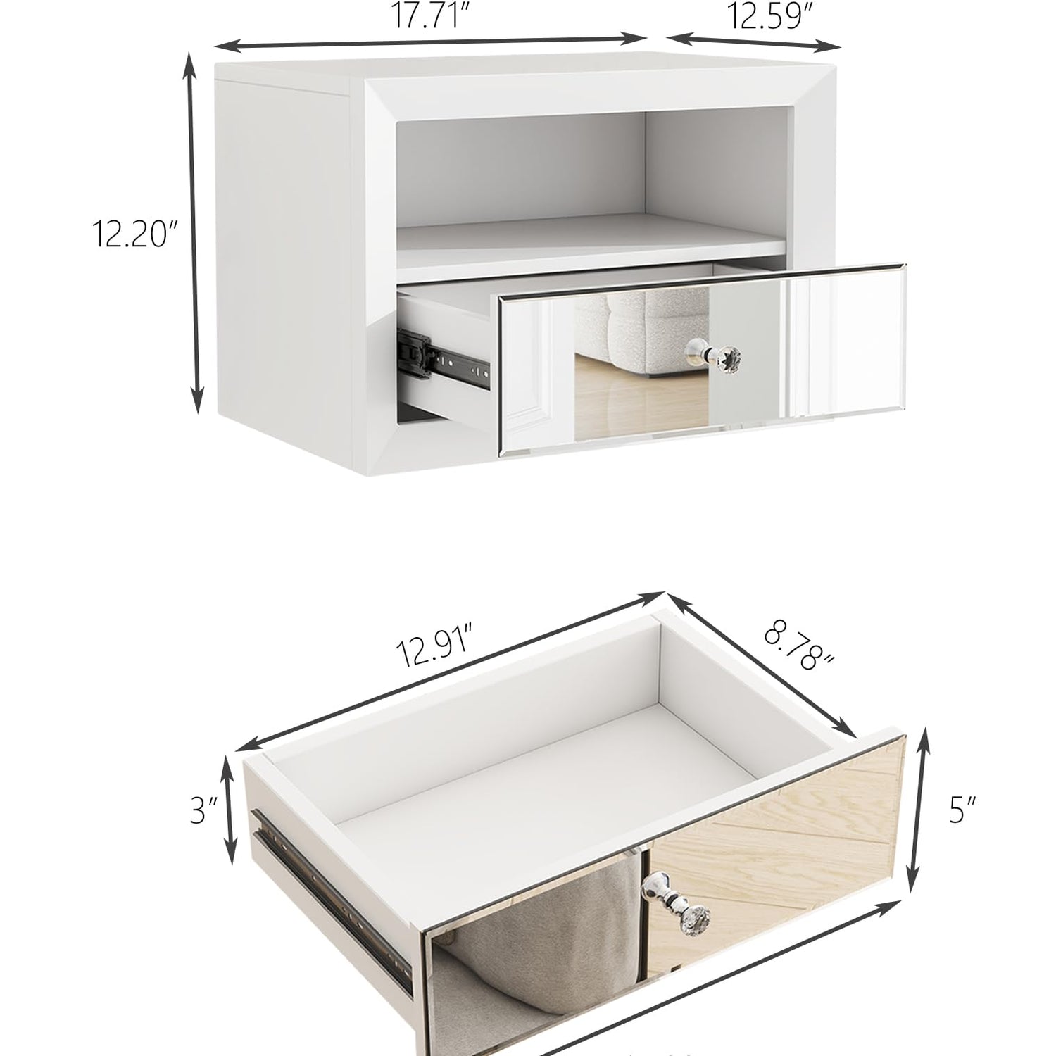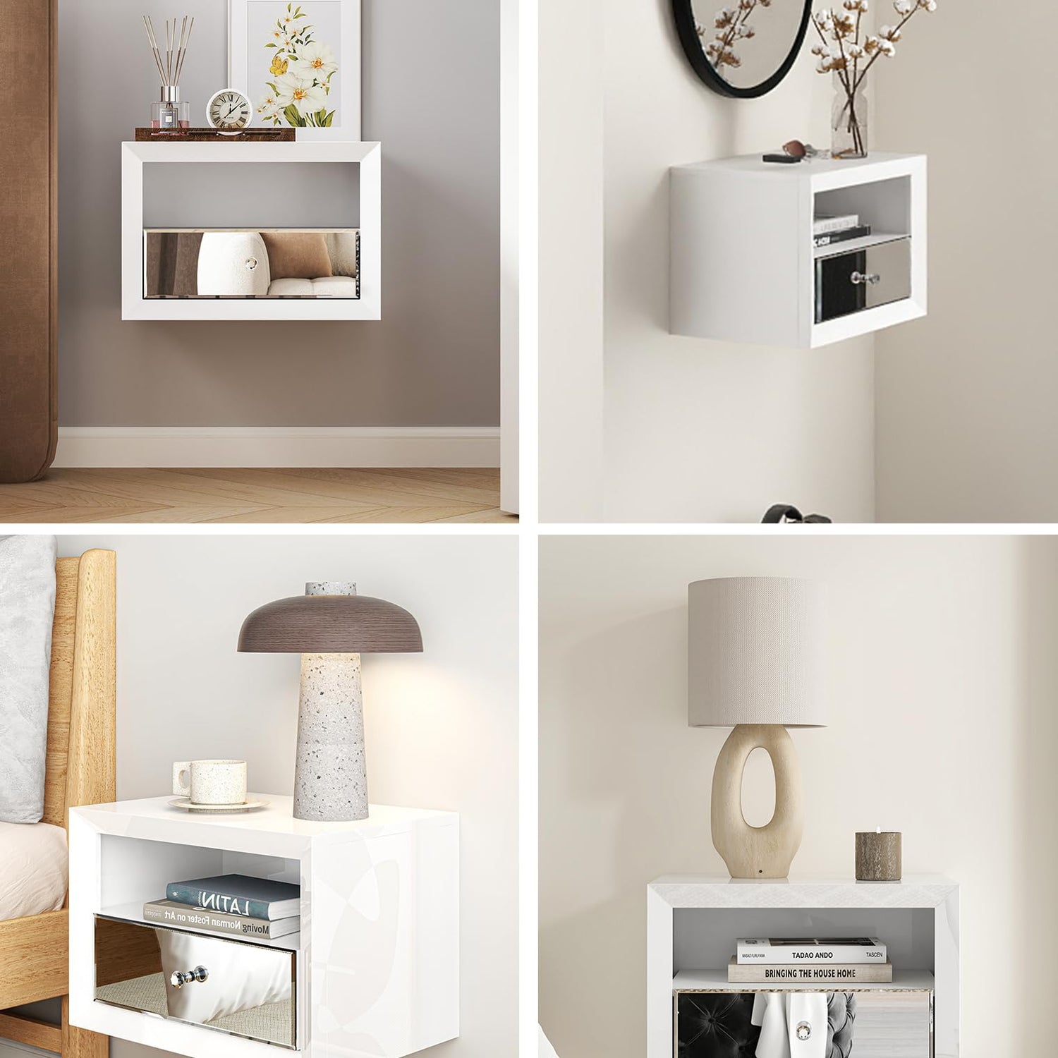- Durable Bedroom Nightstand: Crafted from stable MDF with elegant mirrored glass, this white wall-mounted nightstand adds a smooth and stylish touch, complementing any decor while enhancing your room with its clean lines