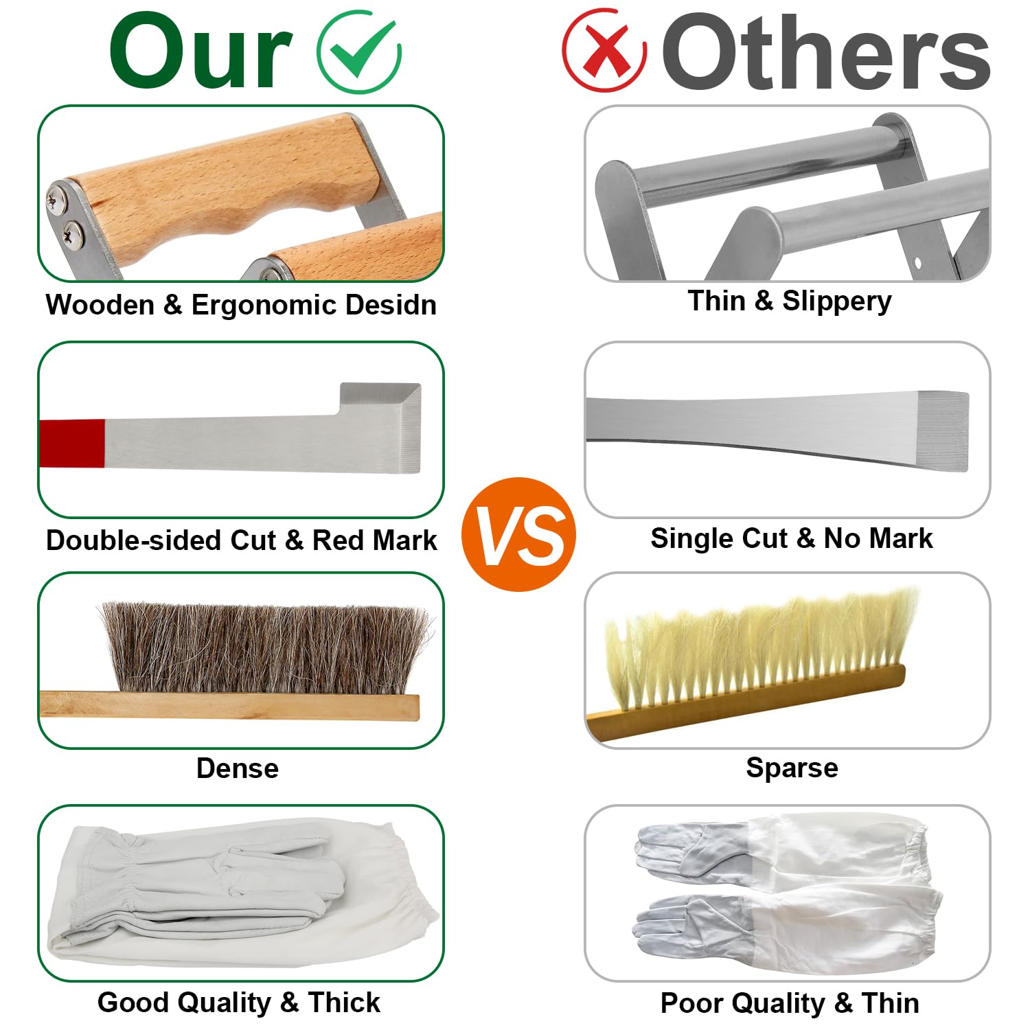 - Sturdy: Our bee keeping tools are made from stainless steel, plastic, and wood, ensuring they are highly resistant to bending or warping. Also, the bee smoker pellets are made of plant, which are gentle and harmless to bees.