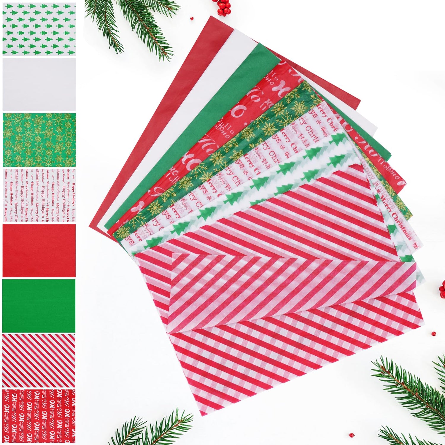 - Various Designs: Our 13.8" x 19.7" tissue paper is available in 8 designs, including the classic three solid colors: red, white and green, and Christmas tree, diagonal stripes, green snowflake, red letter on white and white letter on red patterns,great for your Christmas decorations