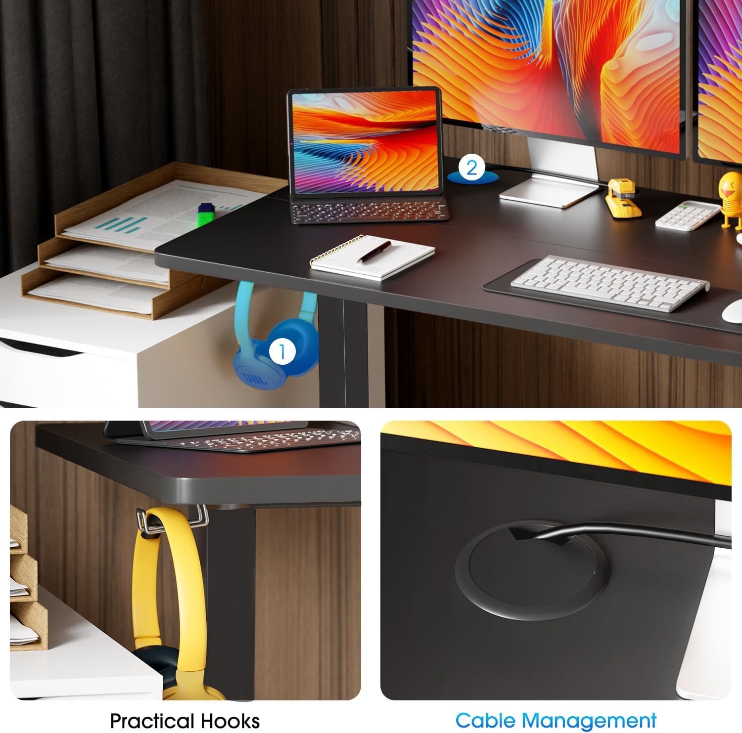 - 【Multi-functional Desk】Large work desk measures 24" D x 40" W. The spacious desk surface provides ample space for various work items. The computer desk is also equipped with headphone hooks and cord collect holes, which help your adjustable desk be neat and tidy.