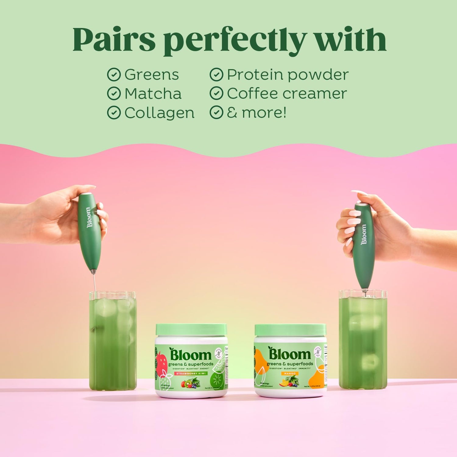 • HIGH QUALITY FROTHER WAND: Our High Powered Hand Frother instantly blends your favorite Bloom supplements to perfection (no clumps here!). Use for your Bloom greens, collagens, proteins, and more to help fuel your body with the nutrients it needs!