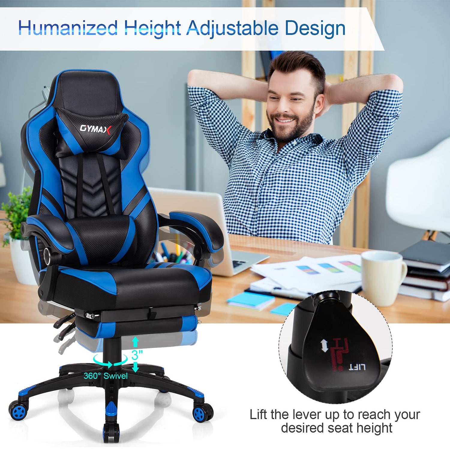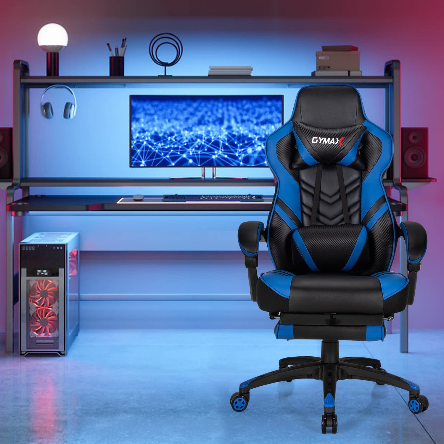 Blue Gaming Chair Ergonomic Computer Chair for Adults Teens Reclining Gamer Chair High Back Game Chair Racing Style Desk Chair with Retractable Footrest, Lumbar Support and Headrest