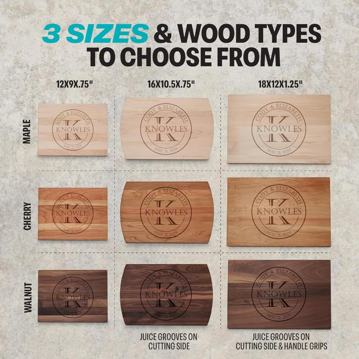 - An Exquisite Family Keepsake: Your one-of-a-kind customized cutting board in Cherry, Maple, or Walnut is certain to become one of the most treasured items in its lucky new home. Whether you treat yourself or gift it to someone special for a wedding, anniversary, birthday, housewarming, or ‘just because,’ enjoy the stunning beauty and functionality of this heirloom-quality board.