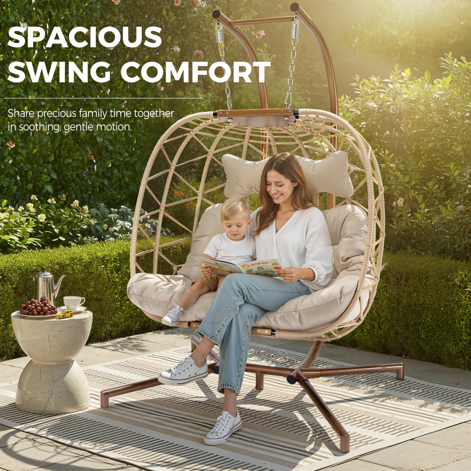 BLUEXYARD 2 Person Hanging Egg Chair with Stand, Extra Large 700 Lbs Wicker Patio Hammock Loveseat Swing, Oversized Cushioned Double Swing Chair for Indoor Outdoor Garden Balcony Backyard, Beige