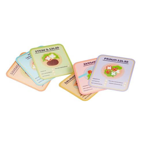 - GRILL GRIN – Whether your little chef is cooking up a delicious Sausage Sizzle or a healthy Prawn Salad, the 6 recipe cards make it easy to follow the ingredients included in each dish and provides a fun matching game.