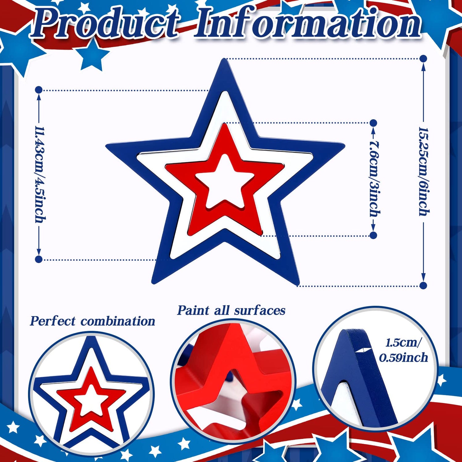 - Proper Hanging Size: the big Independence Day decoration measures about 16.5 cm/ 6.5 inches, medium wooden star ornament measures about 11.5 cm/ 4.5 inches, and the small star is about 7.5 cm/ 3 inch, the thickness is about 0.6 inch, the appropriate size allows you to hang the plaques easily
