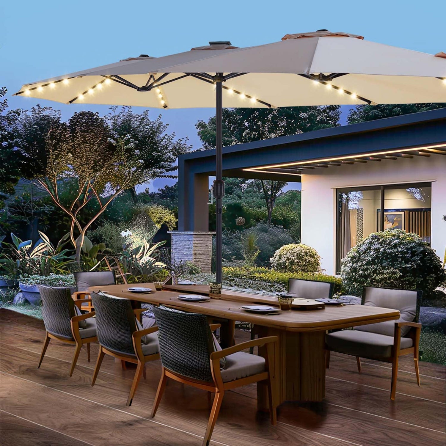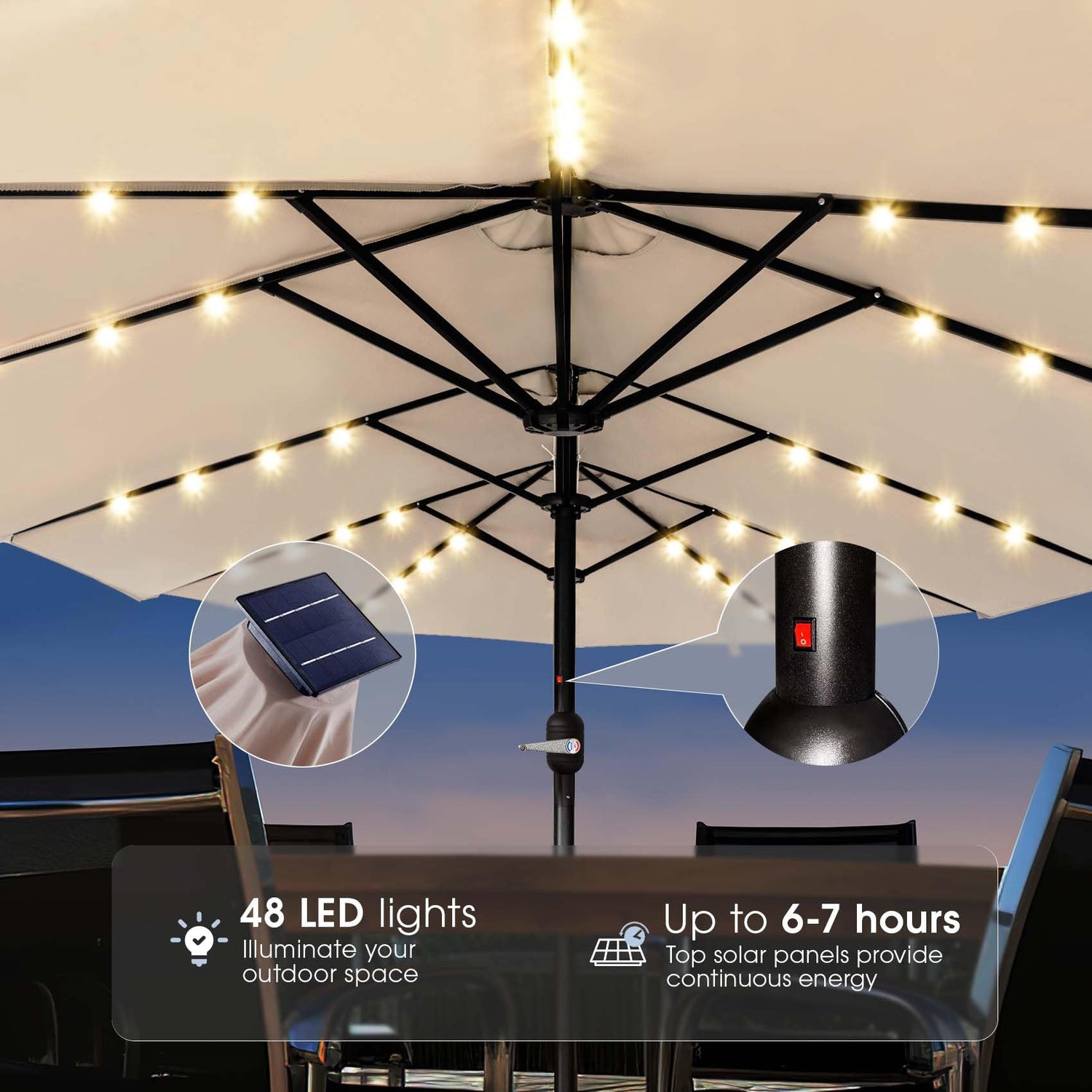 BLUU 15FT Solar LED Patio Umbrella with Base,Outdoor Double-Sided Umbrella with Crank Handle, Powerful UV Protective, for Pool Lawn Garden,Beige