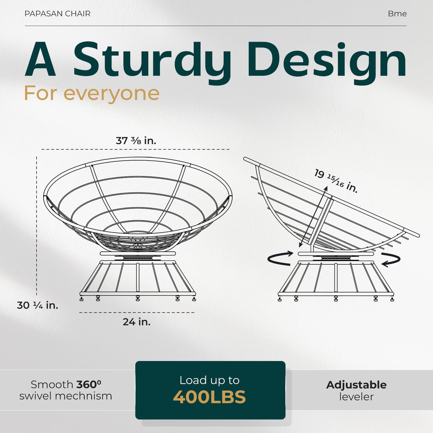 - 360 DEGREE SWIVEL PAPASAN CHAIR: The papasan chair frame is made of solid metal and expertly woven resin wicker; 360 degree swivel papasan chair base has a smoothly rotating structure without noises and friction; Five levelers protect your floor and are easily adjustable for stability of wicker papasan chair
