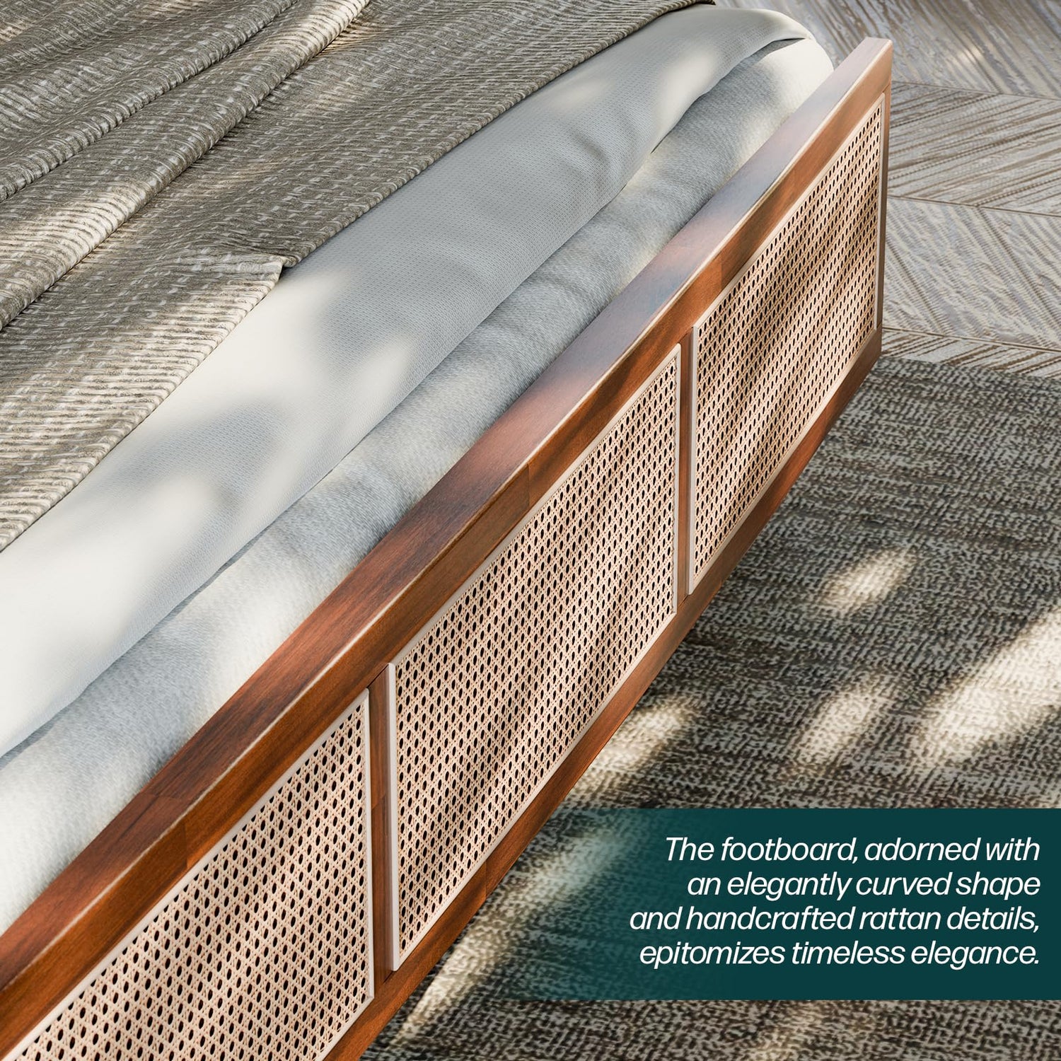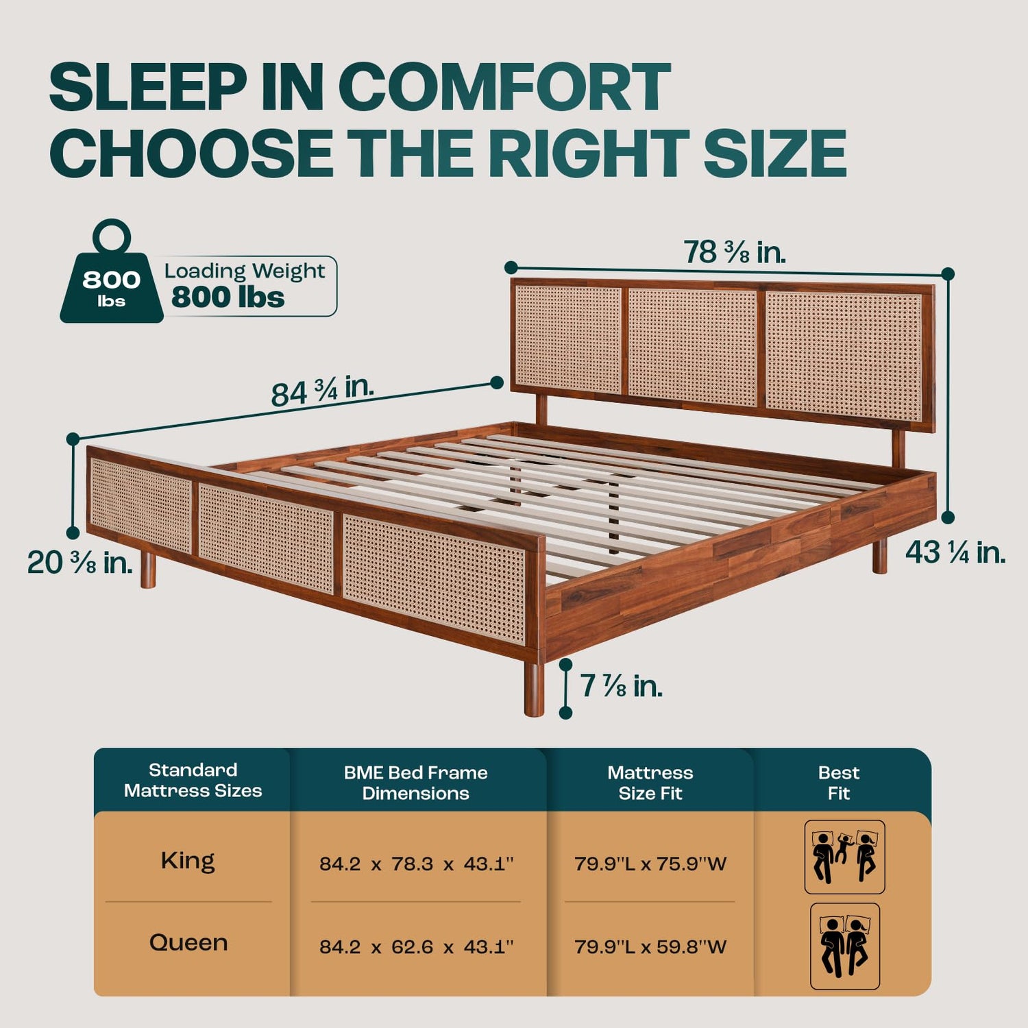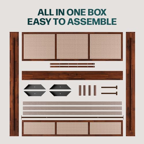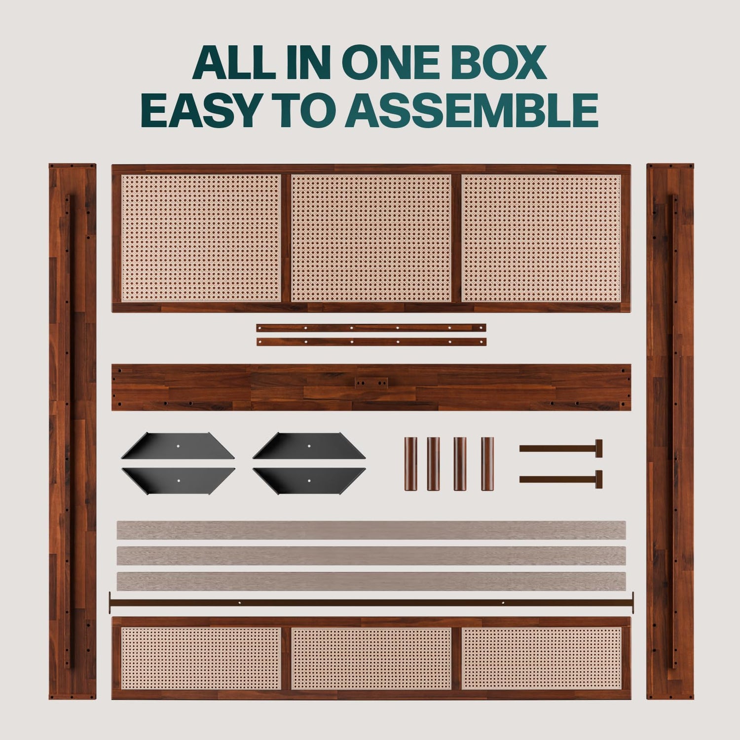 With its handcrafted geometric headboard, this king bed frame makes a striking statement in any bedroom. The inlaid rattan accents add a soft and dreamy touch, enhancing the natural beauty of the hardwood. The unique 3D geometric pattern speaks to artistic elegance while maintaining a rustic charm.