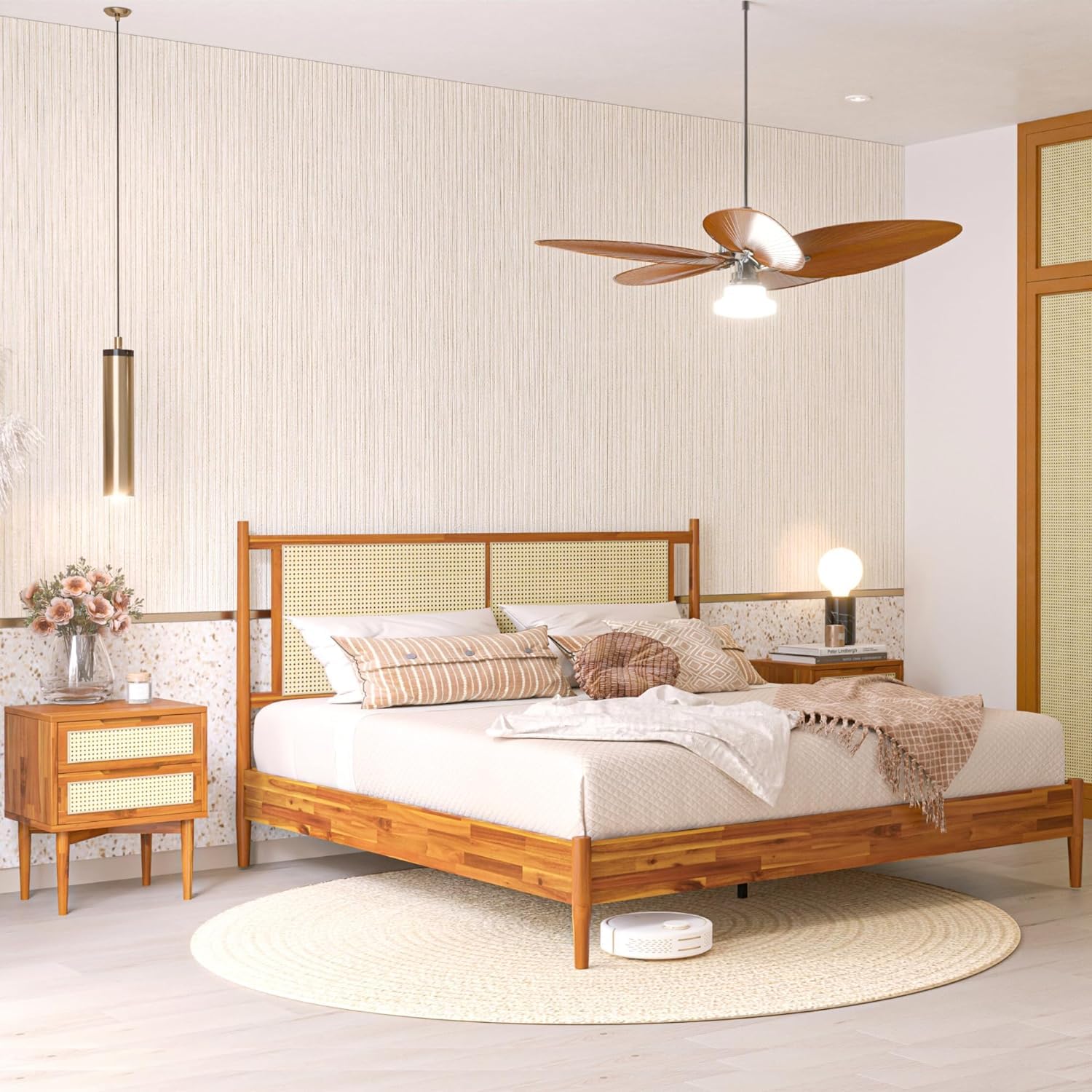 - BUILT TO LAST: Our luxury platform bed frame queen size with headboard is crafted from stunning acacia wood with sturdy construction for long lasting durability; The interwoven rattan headboard boasts a striqueen fusion of original materials, creating a unique charm