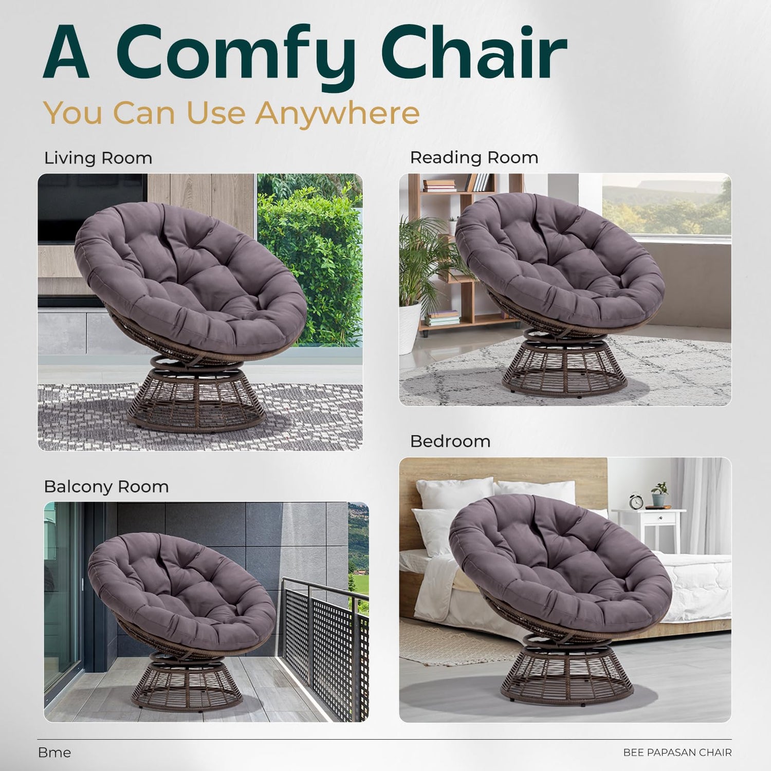 Bme Smoky - Brown Bee Base 40" Ergonomic Wicker Papasan Chair with Soft Thick Density Fabric Cushion, Bee-Designed Base, High Capacity Steel Frame, 360 Degree Swivel for Living, Bedroom, Reading Room