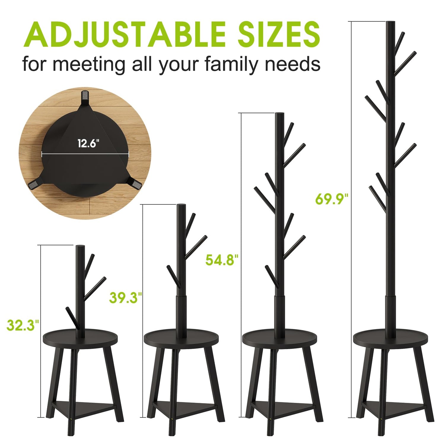 - 4 Heights Available:Our coat rack with tray storage can be installed in 4 heights (32.3", 39.3", 54.8", 69.9" respectively), the freestanding coat rack is solid and practical,bringing ultra-smooth, sturdy and solid and practical coat rack to your home life