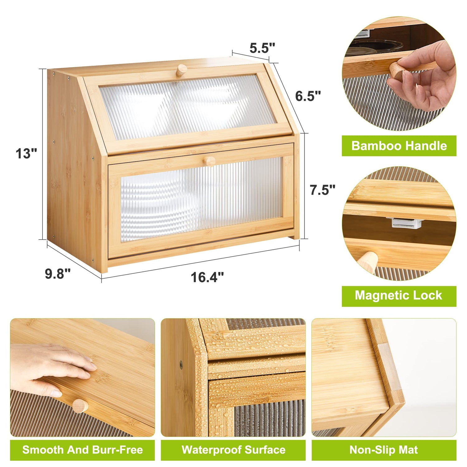 - Space Saving: The breadbox door handle is smooth and burr-free, the magnetic lock prevents the door from being tightly closed, and the top countertop saves space